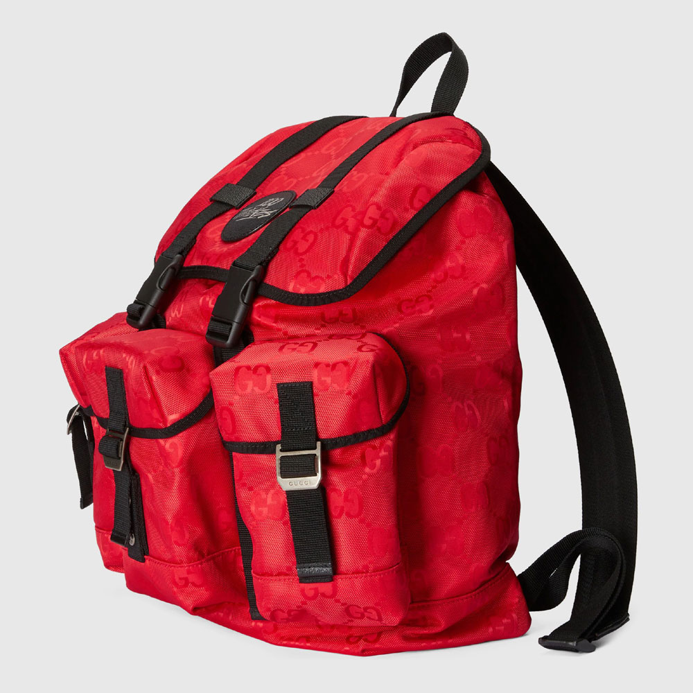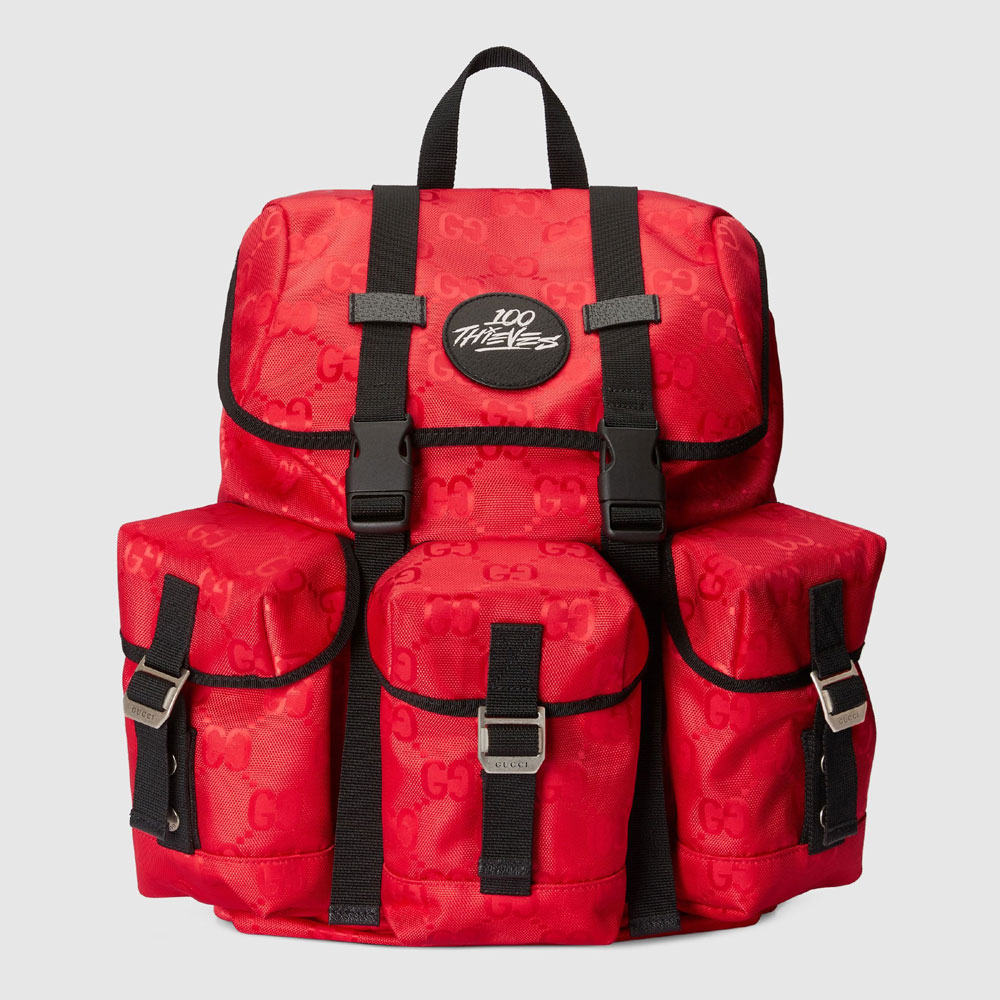 In collaboration with 100 Thieves. Premium lifestyle brand and gaming organization. The Gucci Off The Grid backpack is reimagined in red. Designed for those mindful of their environmental impact. The entire line uses recycled. Organic. Bio-based and sustainably sourced material. Here. The limited-edition item's vibrant take speaks to the brand's shared values of freedom and self-expression.