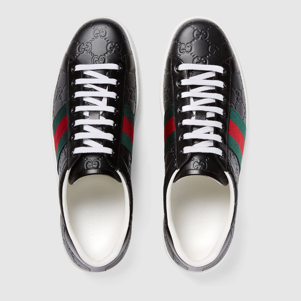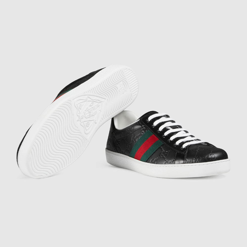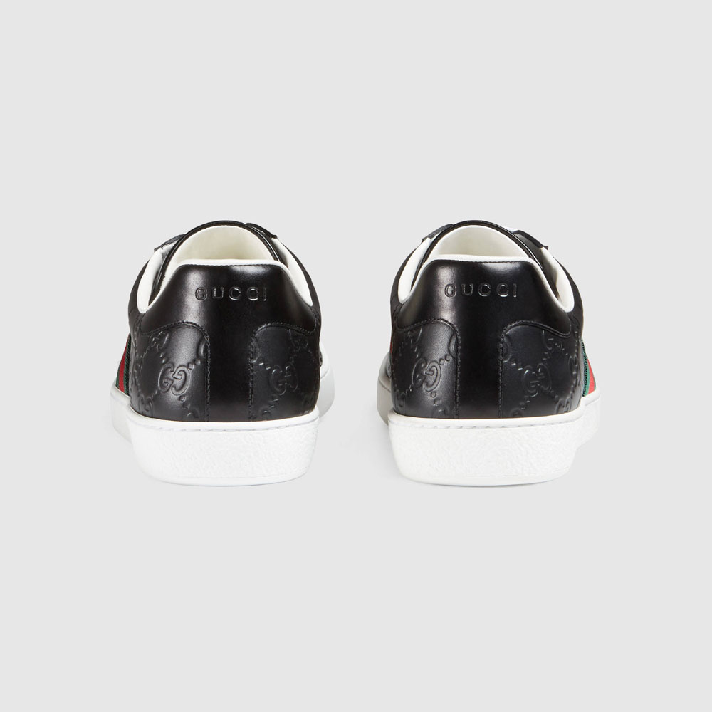 Our classic low-top sneaker with Web, made in heat debossed Gucci Signature leather resulting in a defined print with a firm texture.