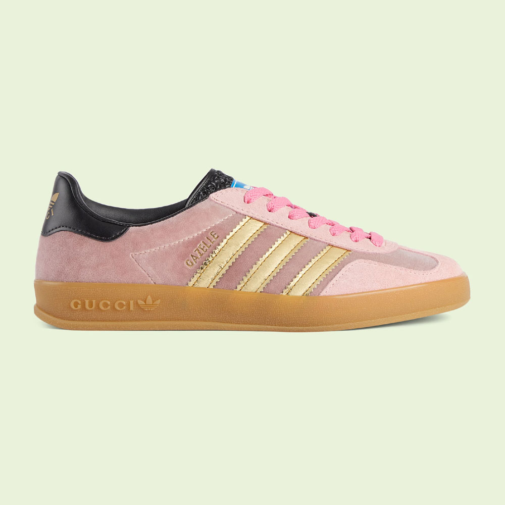 Emblematic Houses motifs mix with those of the historic sportswear brand adidas. The collection sees both heritages encoded in a trio of lines. where adidas and Gucci combine archival emblems. Creative Director. Alessandro Michele pulls inspiration from his memories of the 80s and 90s for a collection that is both nostalgia-driven and contemporary. These Gazelle sneakers have a Trefoil print and stripes.