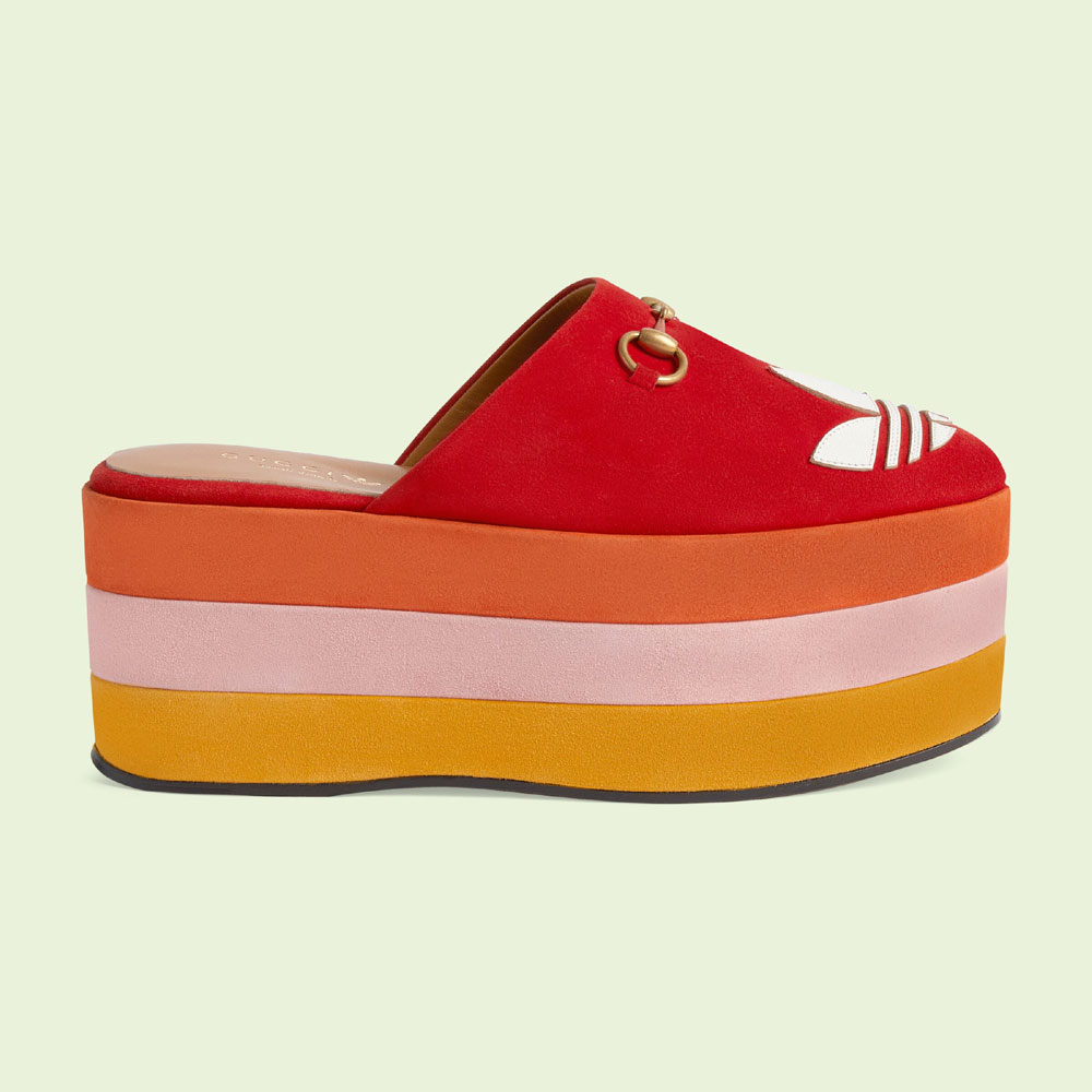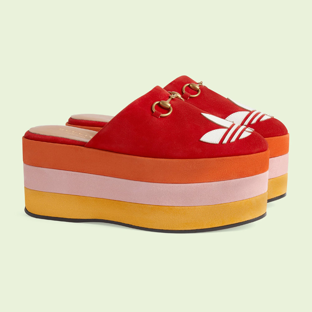 Part of the adidas x Gucci collection. this platform sandal features a Trefoil leather patch. adidas and Gucci venture into a collection. where the Web juxtaposes with the three white stripes. and the GG monogram combines with the trefoil. Pulling inspiration from the Creative Directors memories of the '80s and '90s. emblematic Houses motifs mix with those of the historic sportswear brand adidas�resulting in a series of hybrid looks.