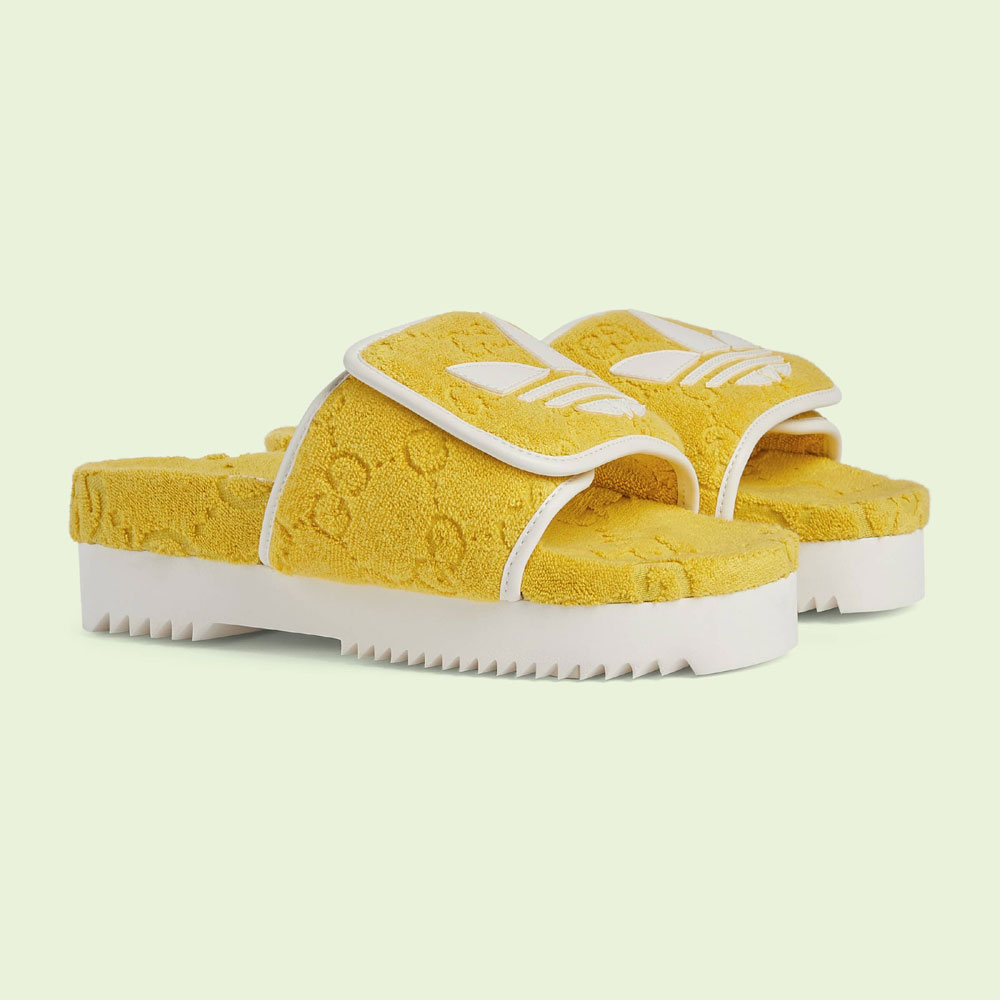Part of the adidas x Gucci collection. this platform sandal features a Trefoil leather patch. adidas and Gucci venture into a collection. where the Web juxtaposes with the three white stripes. and the GG monogram combines with the trefoil. Pulling inspiration from the Creative Directors memories of the '80s and '90s. emblematic Houses motifs mix with those of the historic sportswear brand adidas�resulting in a series of hybrid looks.