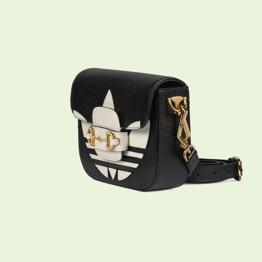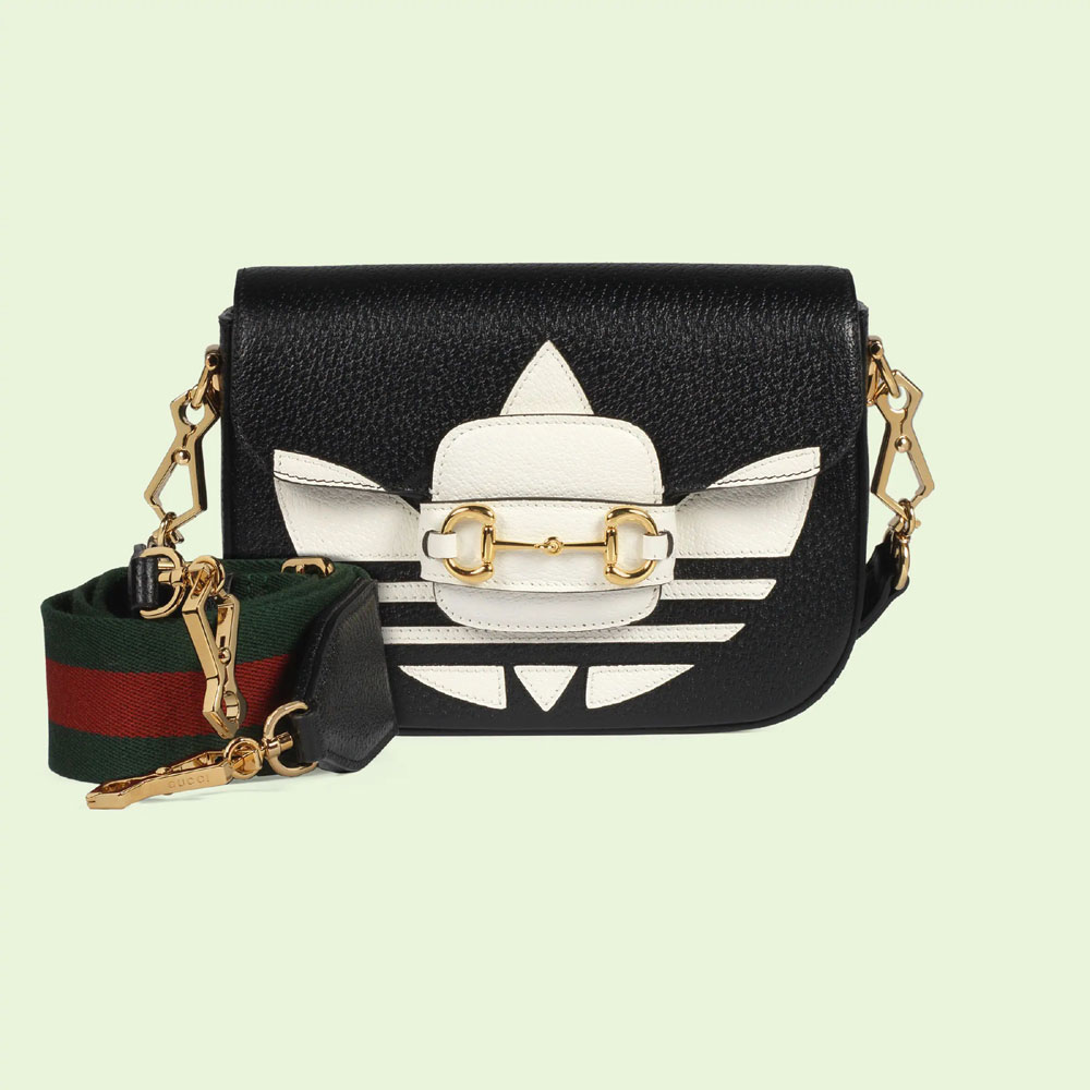 Part of the adidas x Gucci collection. this Gucci Horsebit 1955 mini bag features the Trefoil print. Emblematic Houses motifs mix with those of the historic sportswear brand adidas. The collection sees both heritages encoded in a trio of lines. where adidas and Gucci combine archival emblems. Creative Director. Alessandro Michele pulls inspiration from his memories of the 80s and 90s for a collection that is both nostalgia-driven and contemporary. Size:21 x 14 x 5CM