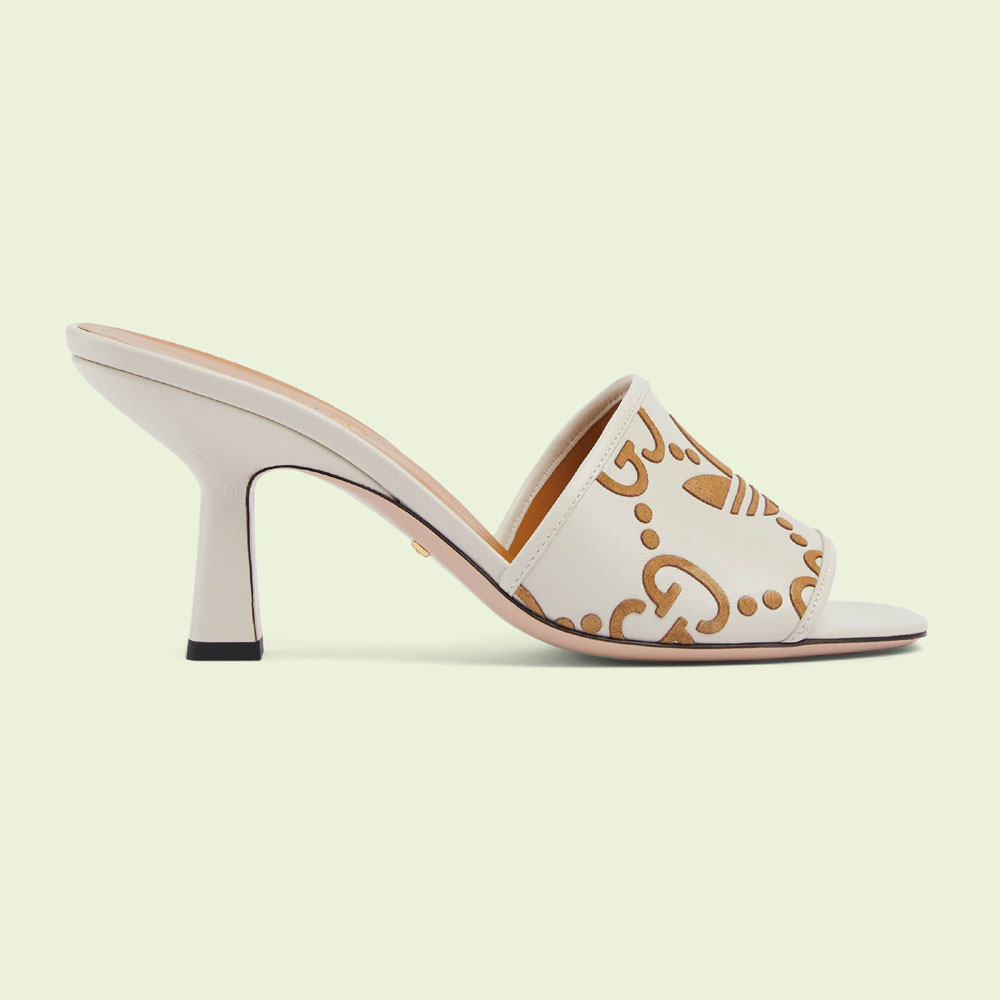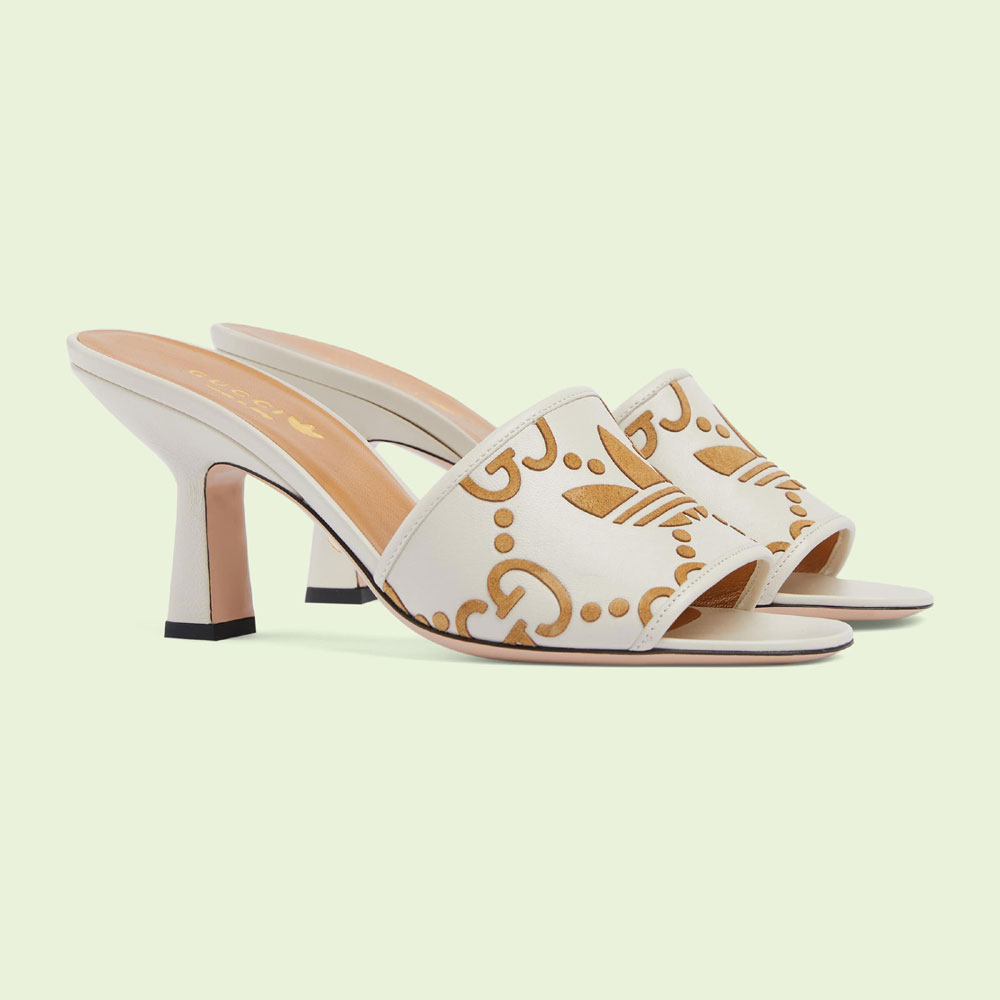 A second chapter in the adidas and Gucci collection. where the Web continues to juxtapose with the three white stripes and the GG monogram combines with the Trefoil. Inspired by the '80s and '90s. emblematic Houses motifs mix with those of the historic sportswear brand adidas resulting in a series of hybrid looks.�This women's slide sandal features a textured GG Trefoil motif.
