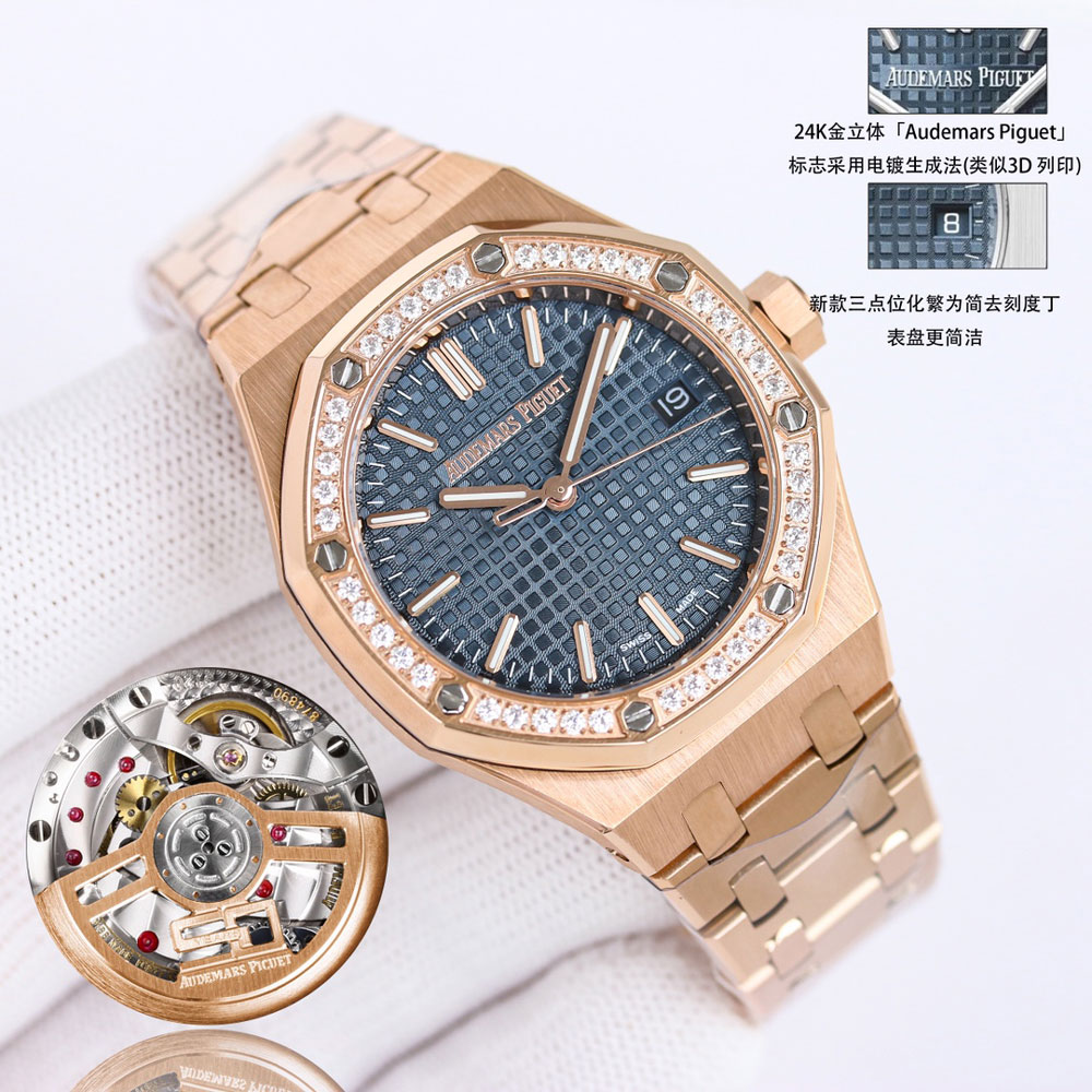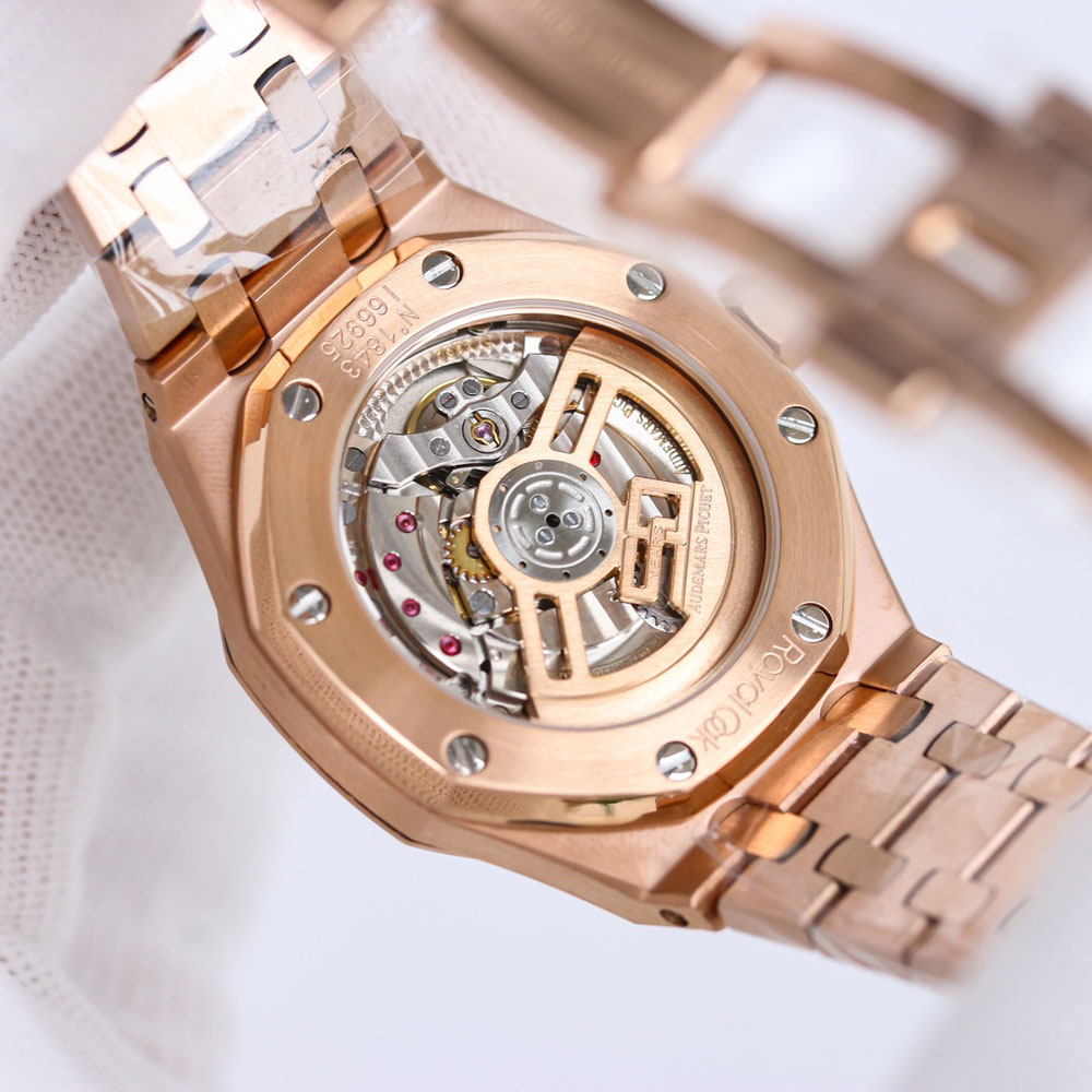 The Audemars Piguet Royal Oak 15551OR.ZZ.1356OR.05 is a stunning 37mm 18k rose gold automatic watch designed for women who appreciate luxury and sophistication. This Royal Oak series timepiece with Calibre 5900 movement perfectly complements elegant eveningwear.
