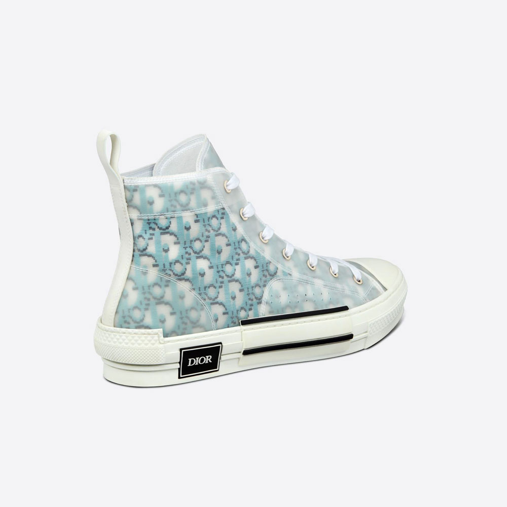 The B23 high-top sneaker is set apart by its layering of transparent paneling and blue Dior Oblique Pixel motif canvas. Essential details, such as eyelets and a lace-up front, a white rubber sole, a reinforced and rounded toe as well as a rear tab recall the codes of the classic high-top style. The sneaker is further enhanced with contrasting details on the sides, including a DIOR signature, and pairs easily with any casual outfit.
