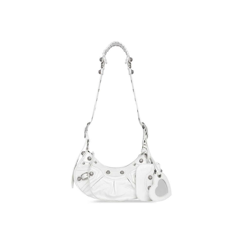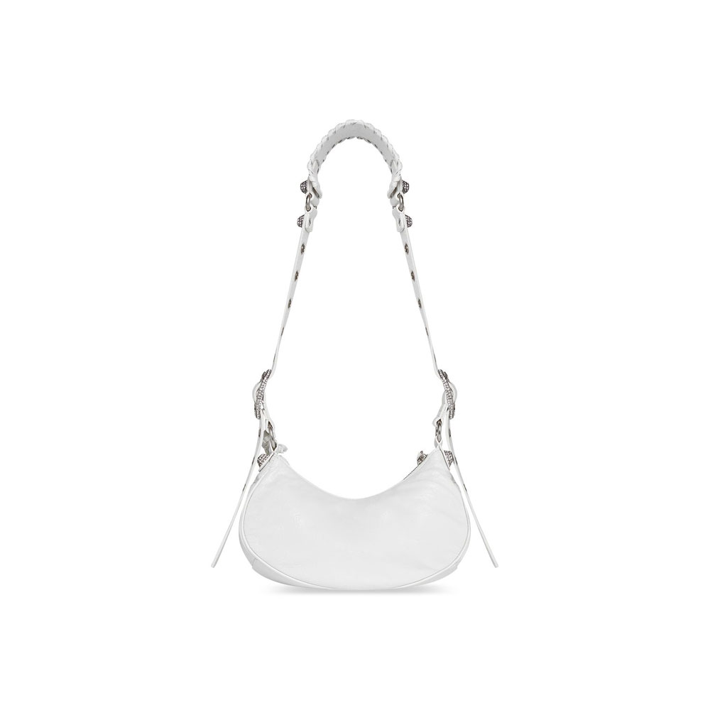 Le Cagole XS Shoulder Bag in white Arena lambskin aged-silver hardware with rhinestones