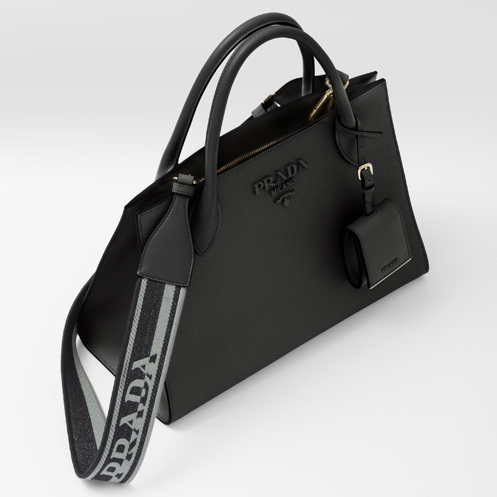One shade colors the entire Prada Monochrome bag made of Saffiano leather and accented with the metal lettering logo. Saffiano leather. Prada's iconic material. is synonymous with luxury and identified with the traditional production of Italian leather goods: a premium leather of the highest quality. it is defined by its crosshatch texture and waxed finish.