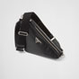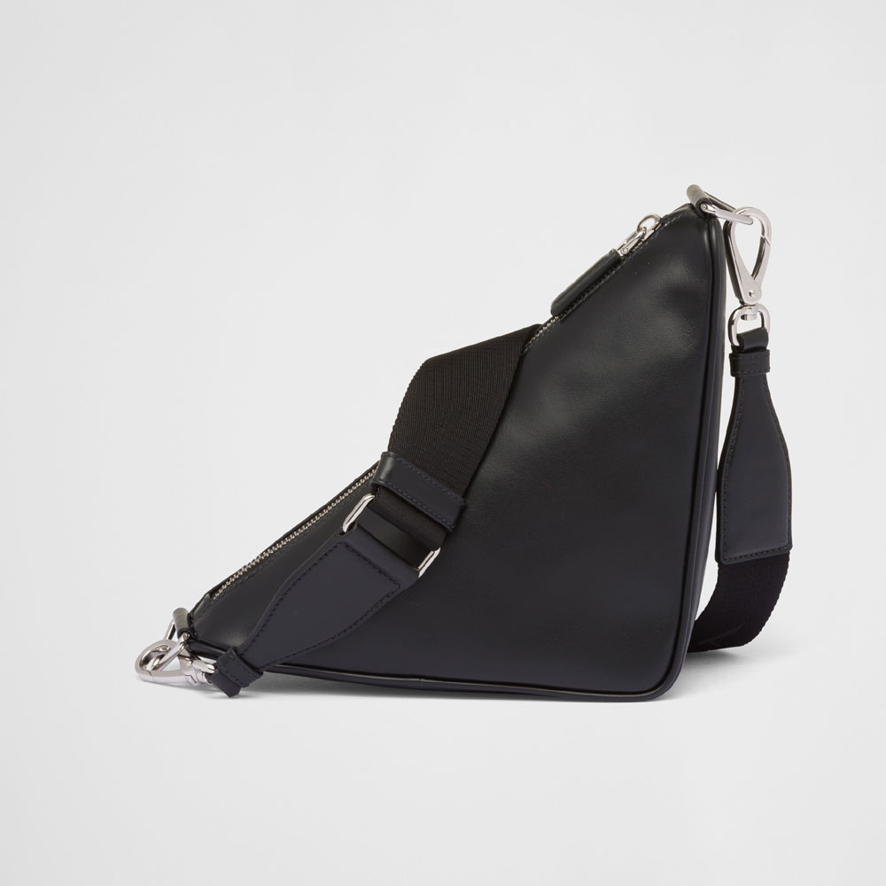 This bag made of soft leather innovatively reinvents the brand's iconic geometric shape. transforming it into a sporty. versatile design. Provided with a removable nylon and leather shoulder strap. the accessory can be worn in various ways and is decorated with the enameled metal triangle logo. Size:W30 x H22 x D11cm