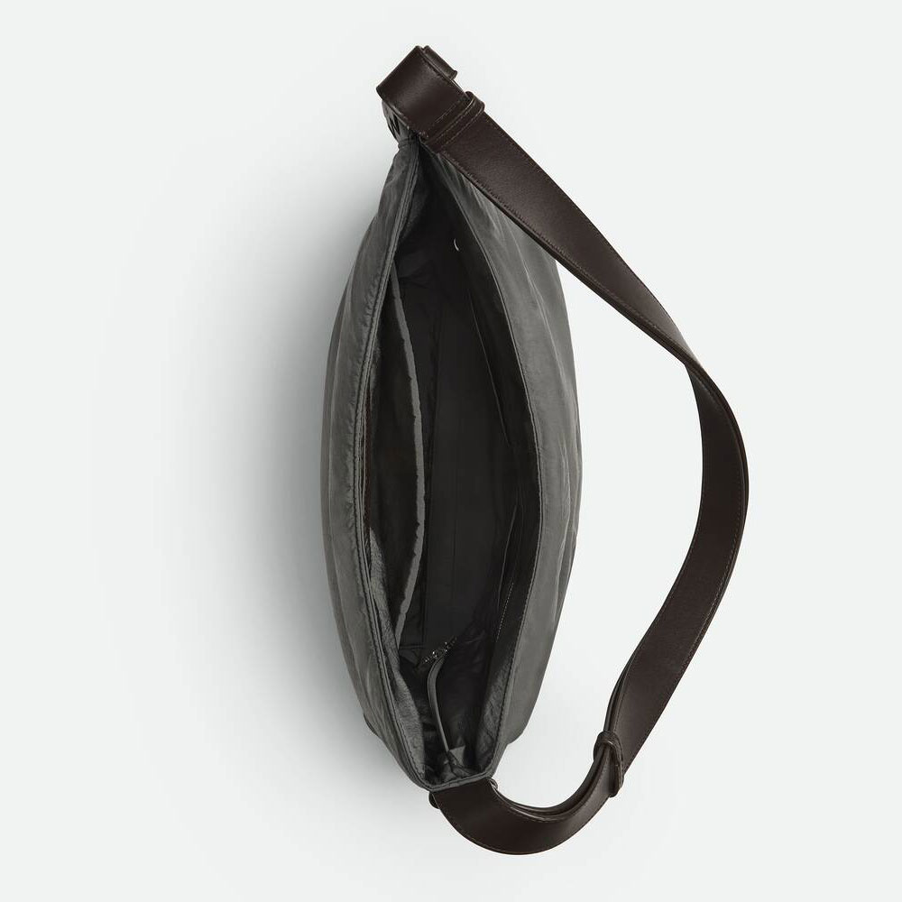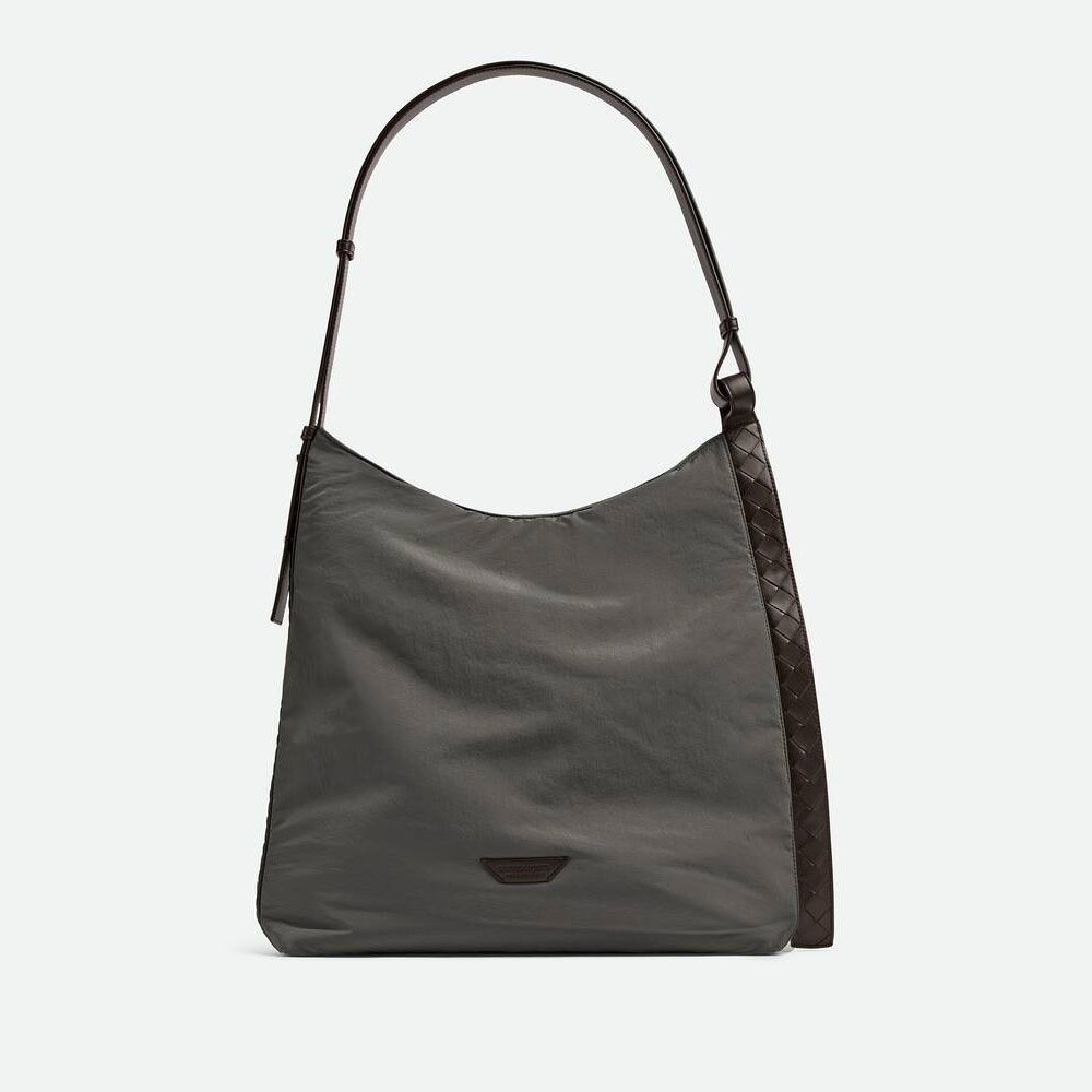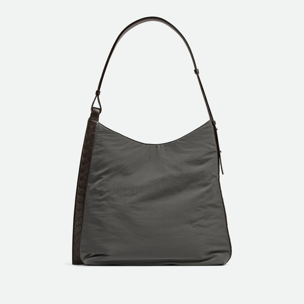 Bottega Veneta Large Crossroad Hobo in Light Graphite effortlessly complements modern menswear. Pair this spacious Hobo with minimalist ensembles like a tailored charcoal overcoat, slim-fit black turtleneck, and dark denim for urban sophistication.