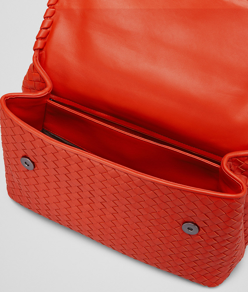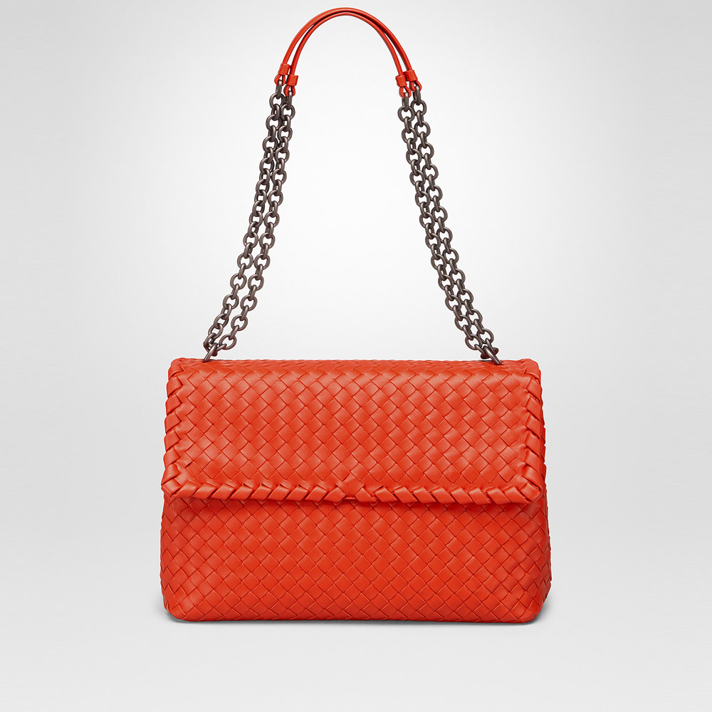 Bottega Veneta medium olimpia bag in vesuvio intrecciato nappa Inspired by the Renaissance architecture of the famous Olympic Theatre in Veneto, the Olimpia bag is the epitome of essential elegance. Crafted in soft nappa, its perfect proportions are underlined by the signature intrecciato and by the square-shaped flap closure. A hidden magnet closes the suede-lined interior, divided into two compartments and fitted with a zip pocket. The leather and chain shoulder strap can be adjusted to wear the bag cross-body. Solid color Magnetic closure Internal pockets Metallic straps