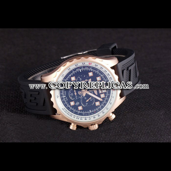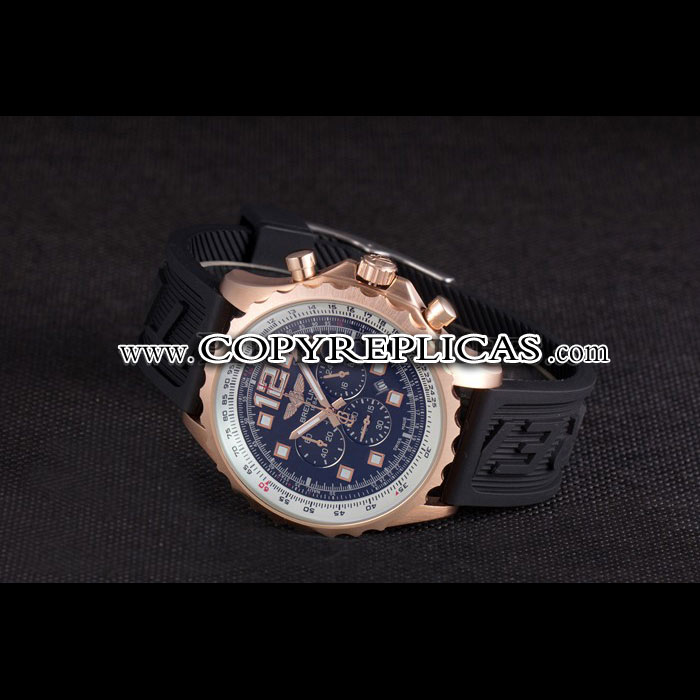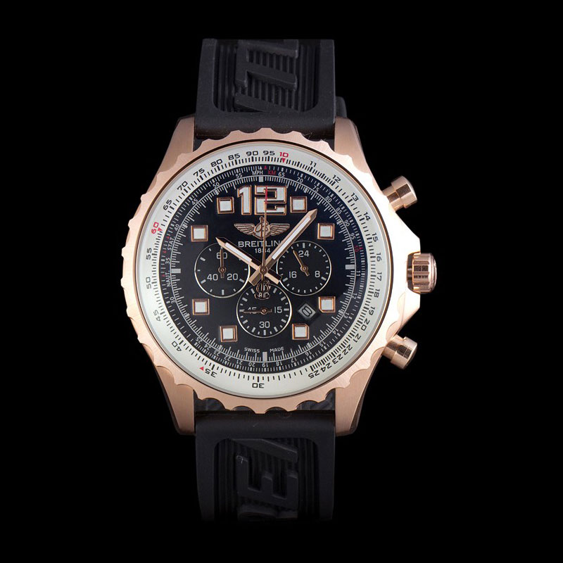 Movement : Quartz (Battery) Quality : Japanese Miyota Case : 18k rose-gold plated case Back : Polished stainless steel snap-in back with Breitling engravings Bezel : 18k rose-gold plated cutwork crown Crown : 18k rose-gold plated cutwork crown with Breitling logo and two smaller stainless steel push-button crowns on either side of it Bracelet : Black rubber strap with Breitling logo engraved stainless steel plated hook-buckle clasp Band Type : Rubber Watch Clasp : Buckle Glass : Sapphire Crystal Color : Black Dial Color : Black Gender : Men Diameter : 56 x 49 mm Bracelet Length : 230 x 24 mm Case Thickness : 15 mm Shipping Size : Small