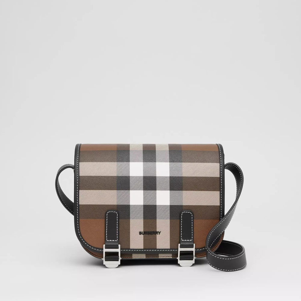 A structured messenger bag reworked in check e-canvas an environmentally conscious canvas primarily made using renewable resources that require less water and generate less CO2 than conventional coated canvases. The design is detailed with our logo and topstitched leather trims. Size:22 x 7 x 19cm/8.7 x 2.8 x 7.5in