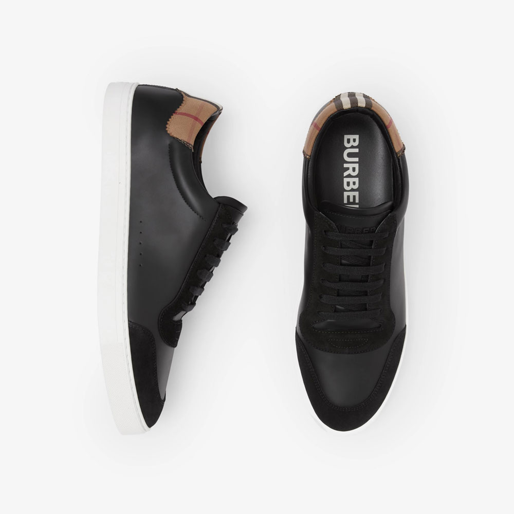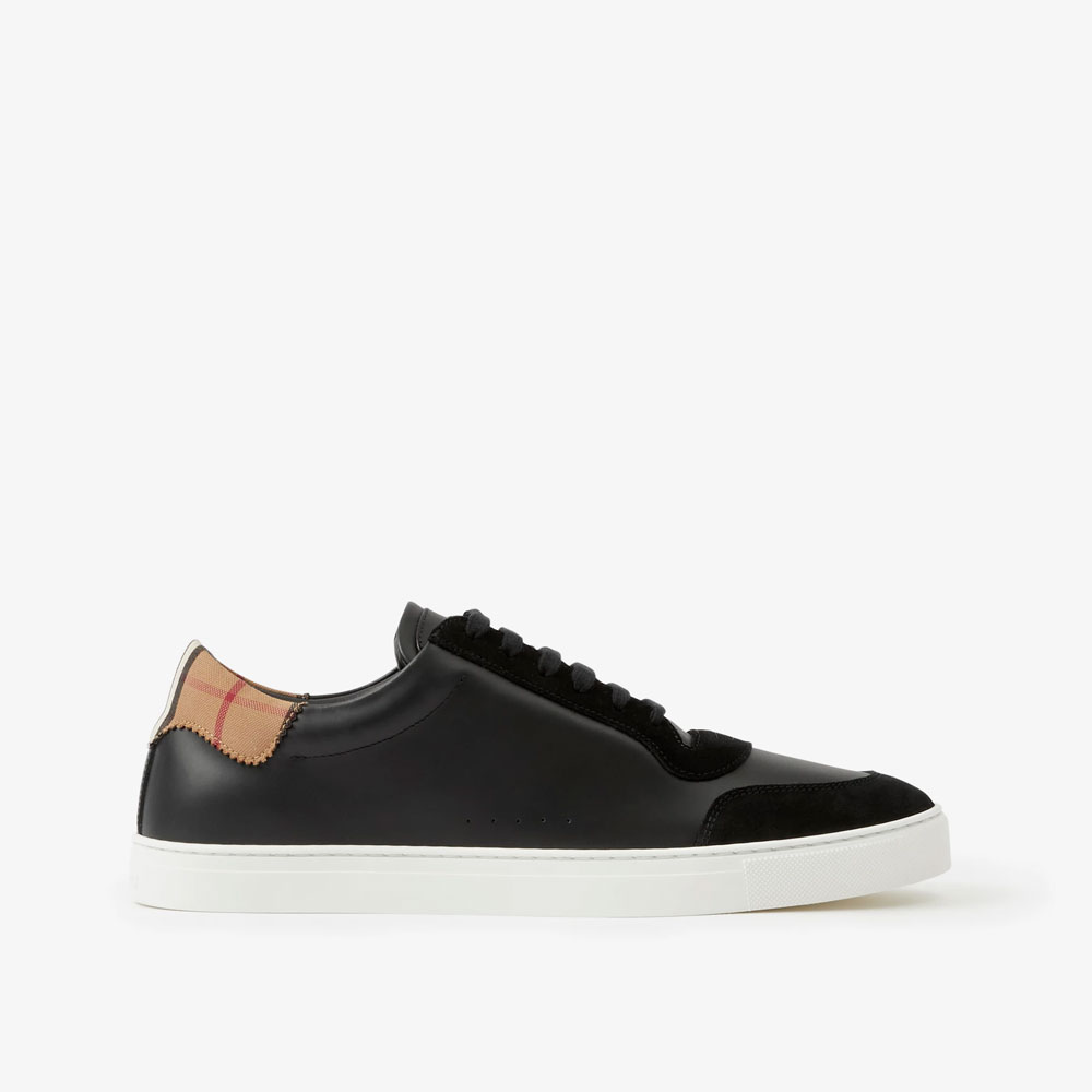 Low-top sneakers in leather and suede accented with contrasting Vintage Check cotton panels. Wear them to polish casual looks.