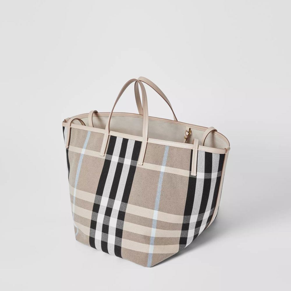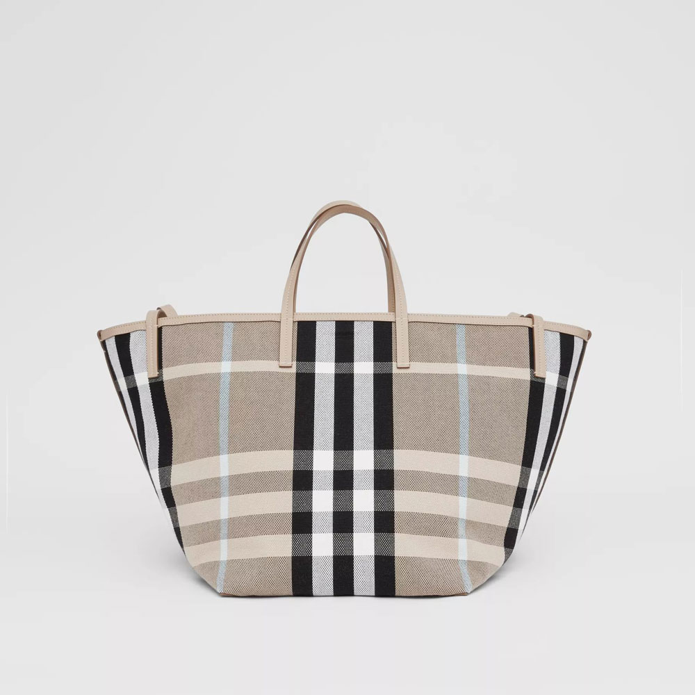 Introducing our Beach Tote an effortless day bag in jacquard-woven check canvas trimmed with topstitched leather. The slouchy style features a detachable zip pouch for smaller essentials. Carry in hand or on the shoulder.