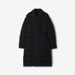 A puffer coat in nylon filled with goose down and feathers, lined at the collar with Burberry Check wool. Inspired by our signature trench, the double-breasted style has a detachable belt to adjust the shape and is appliqued with our B shield, a motif inspired by the Equestrian Knight Design. Part of Burberry Classics