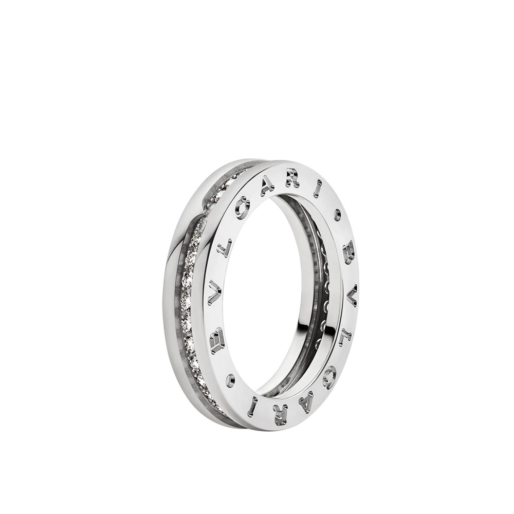 B.zero1 one-band ring in 18 kt white gold. set with pave diamonds on the spiral.