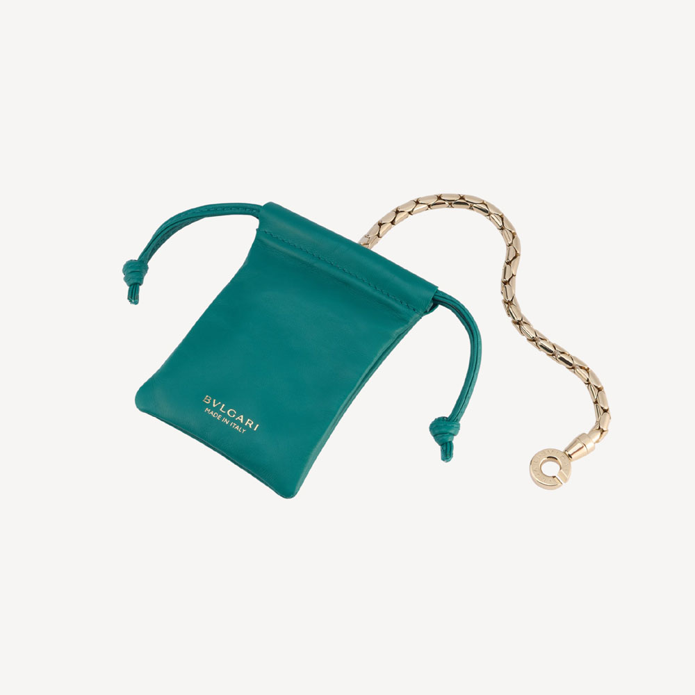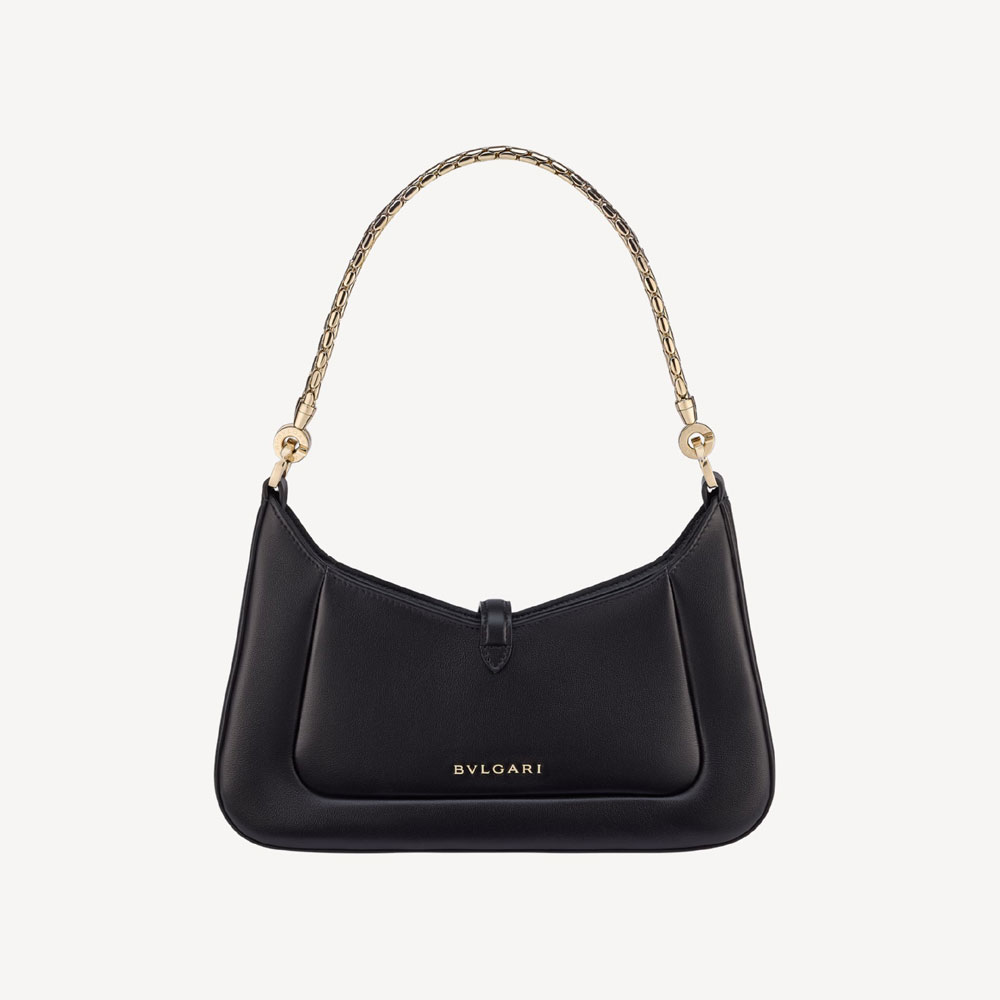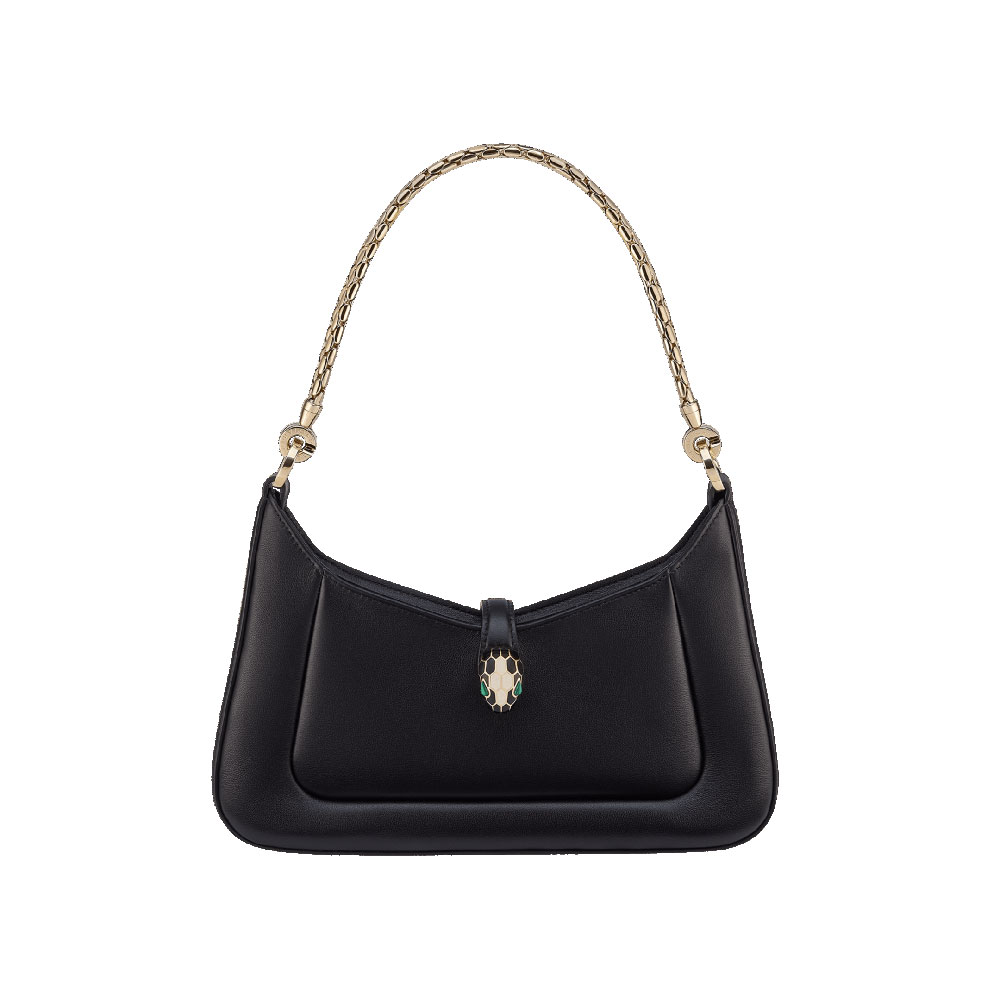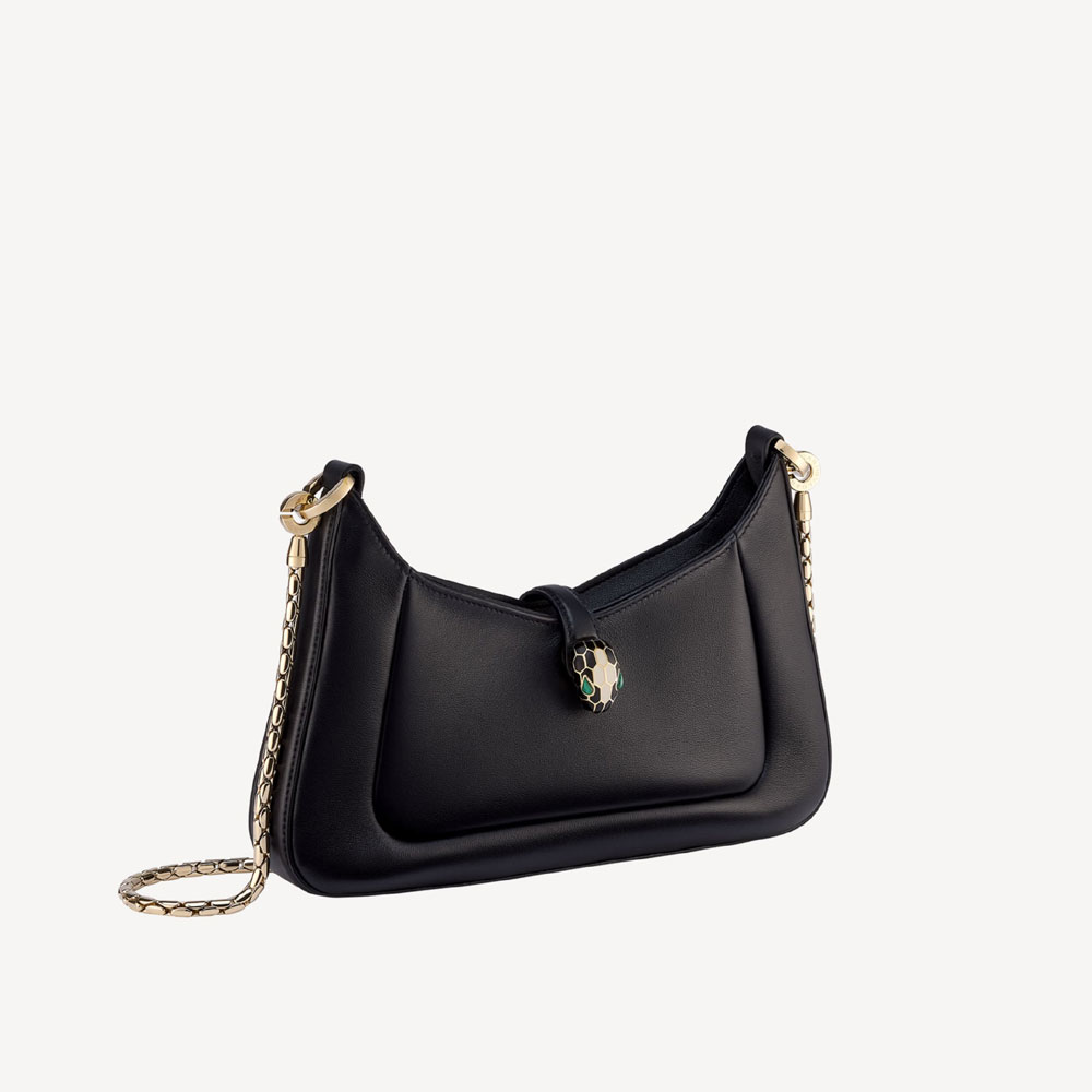 Serpenti Baia small shoulder bag in black Metropolitan calf leather with black nappa leather lining. Captivating snakehead magnetic closure in light gold-plated brass embellished with black and white agate enamel scales, and green malachite eyes; additional zipped top closure. Size:27.5 x 18 x 4.5 cm