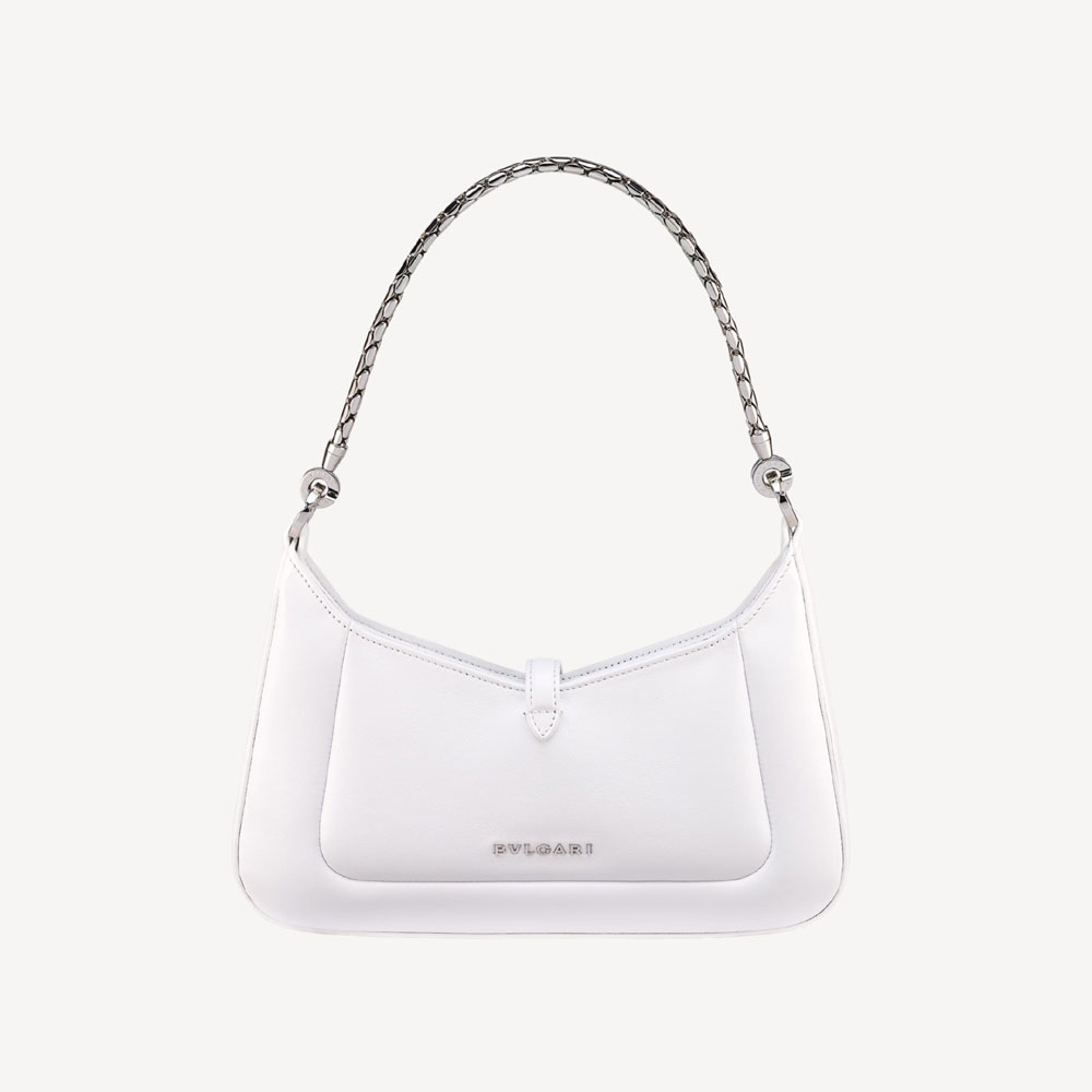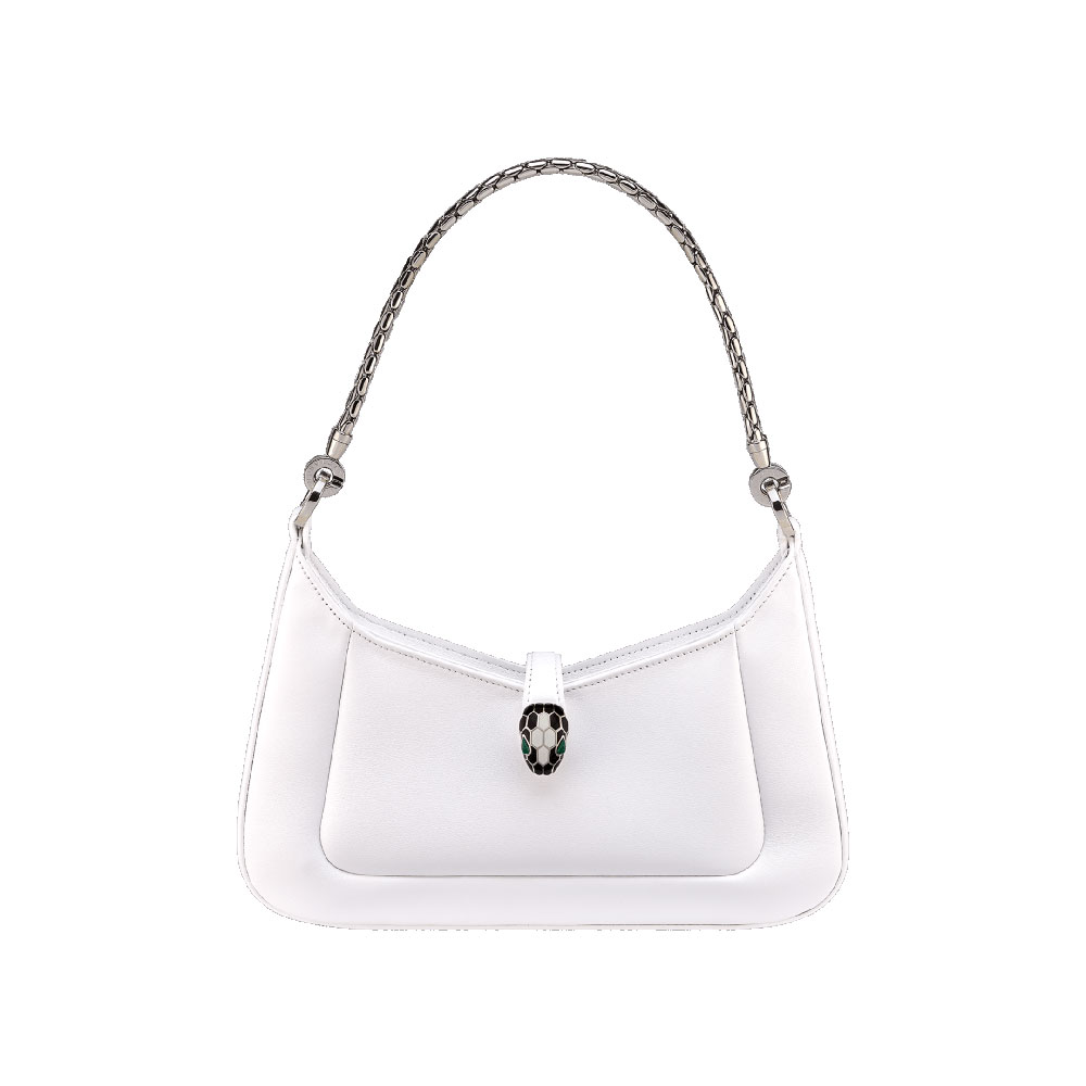 Serpenti Baia small shoulder bag in flash diamond white Metropolitan calf leather with emerald green nappa leather lining. Captivating snakehead magnetic closure in palladium-plated brass embellished with black and flash diamond white enamel scales, and green malachite eyes; additional zipped top closure. Size:27.5 x 18 x 4.5 cm