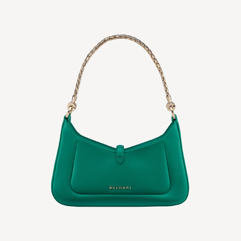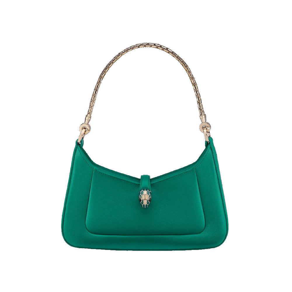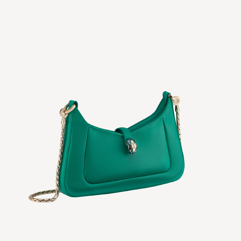 Serpenti Baia small shoulder bag in vivid emerald green Metropolitan calf leather with black nappa leather lining. Captivating snakehead magnetic closure in light gold-plated brass embellished with bright forest emerald green enamel and light gold-plated brass scales, and black onyx eyes; additional zipped top closure. Size:27.5 x 18 x 4.5 cm