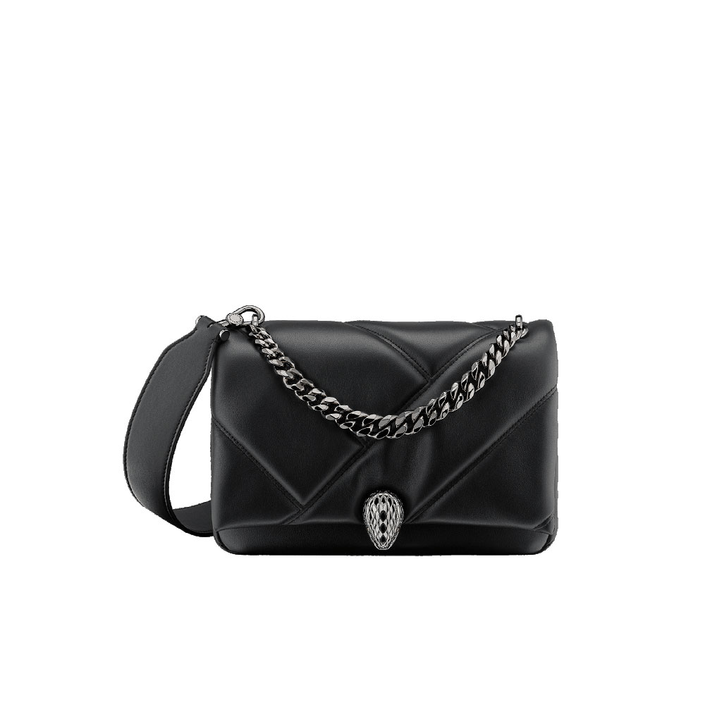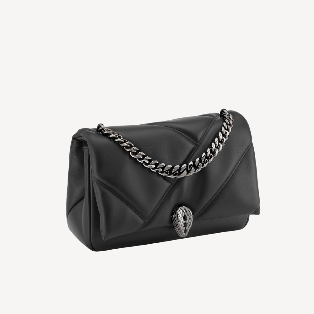 "Serpenti Cabochon" small maxi chain crossbody bag in soft quilted black calf leather, with a maxi graphic motif, and black nappa leather internal lining. New Serpenti head closure in dark ruthenium-plated brass finished with small black onyx scales in the middle and red enamel eyes. Size:21.5 x 15 x 7 cm