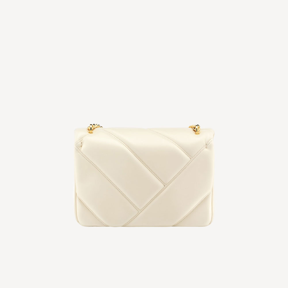 Serpenti Cabochon small maxi chain crossbody bag in soft quilted Ivory Opal white calf leather, with a maxi graphic motif, and black nappa leather internal lining. New Serpenti head closure in gold plated brass, finished with small white mother-of pearl scales in the middle and red enamel eyes. Size:21.5 x 15 x 7 cm