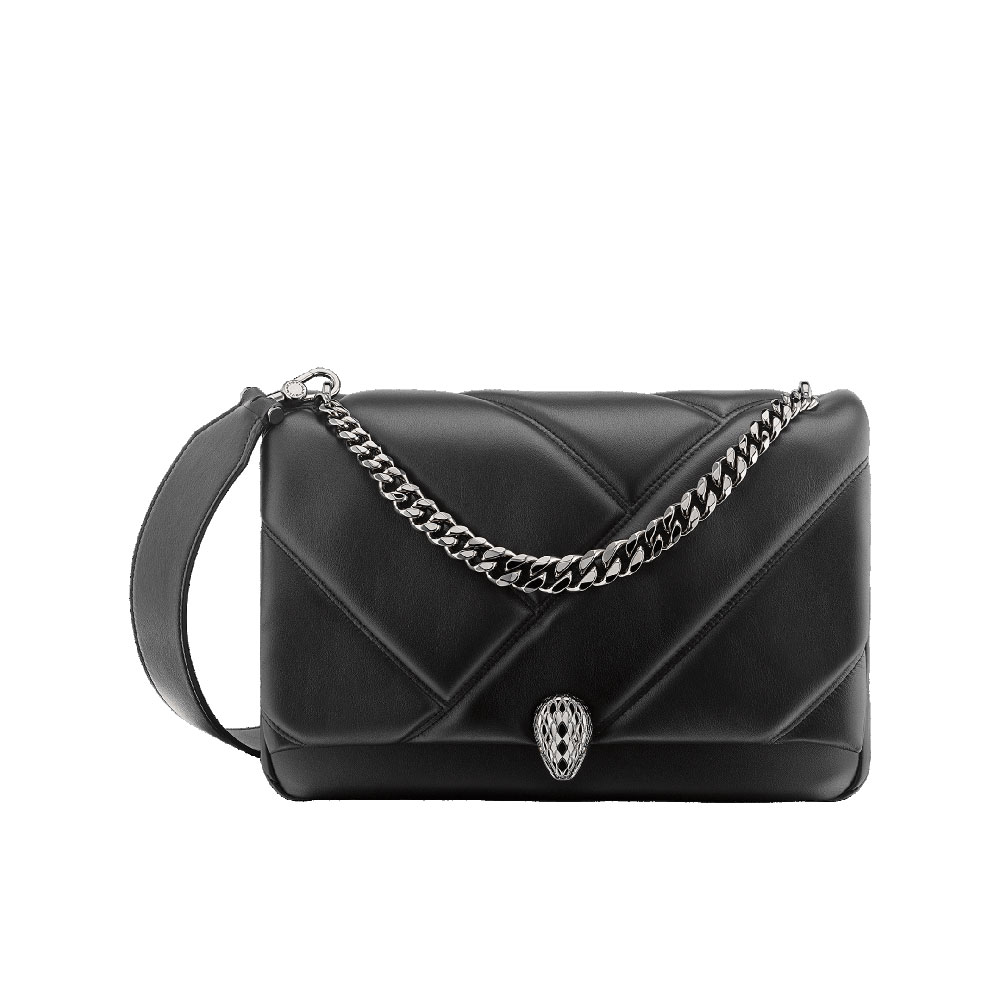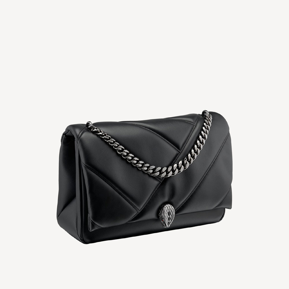 "Serpenti Cabochon" maxi chain crossbody bag in soft quilted black calf leather, with a maxi graphic motif, and black nappa leather internal lining. New Serpenti head closure in dark ruthenium-plated brass finished with small black onyx scales in the middle and red enamel eyes. Size:26 x18 x 8 cm