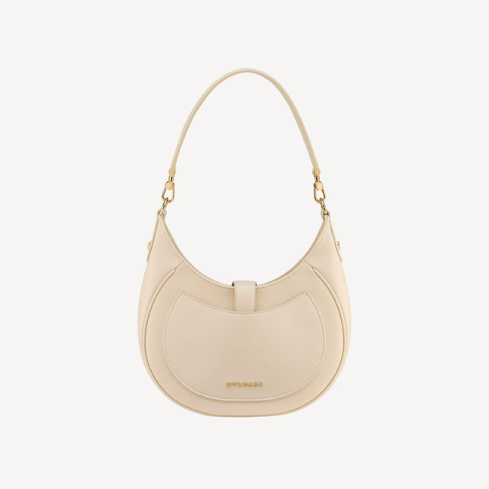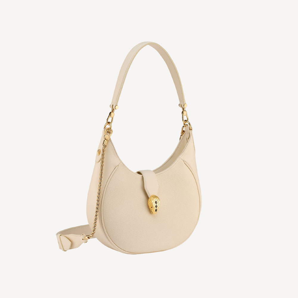 Serpenti Ellipse medium shoulder bag in Urban grain and smooth ivory opal calf leather with flamingo quartz pink grosgrain lining. Captivating snakehead closure in gold-plated brass embellished with black onyx scales and red enamel eyes. Size:25.5 x 25 x 5.5 cm