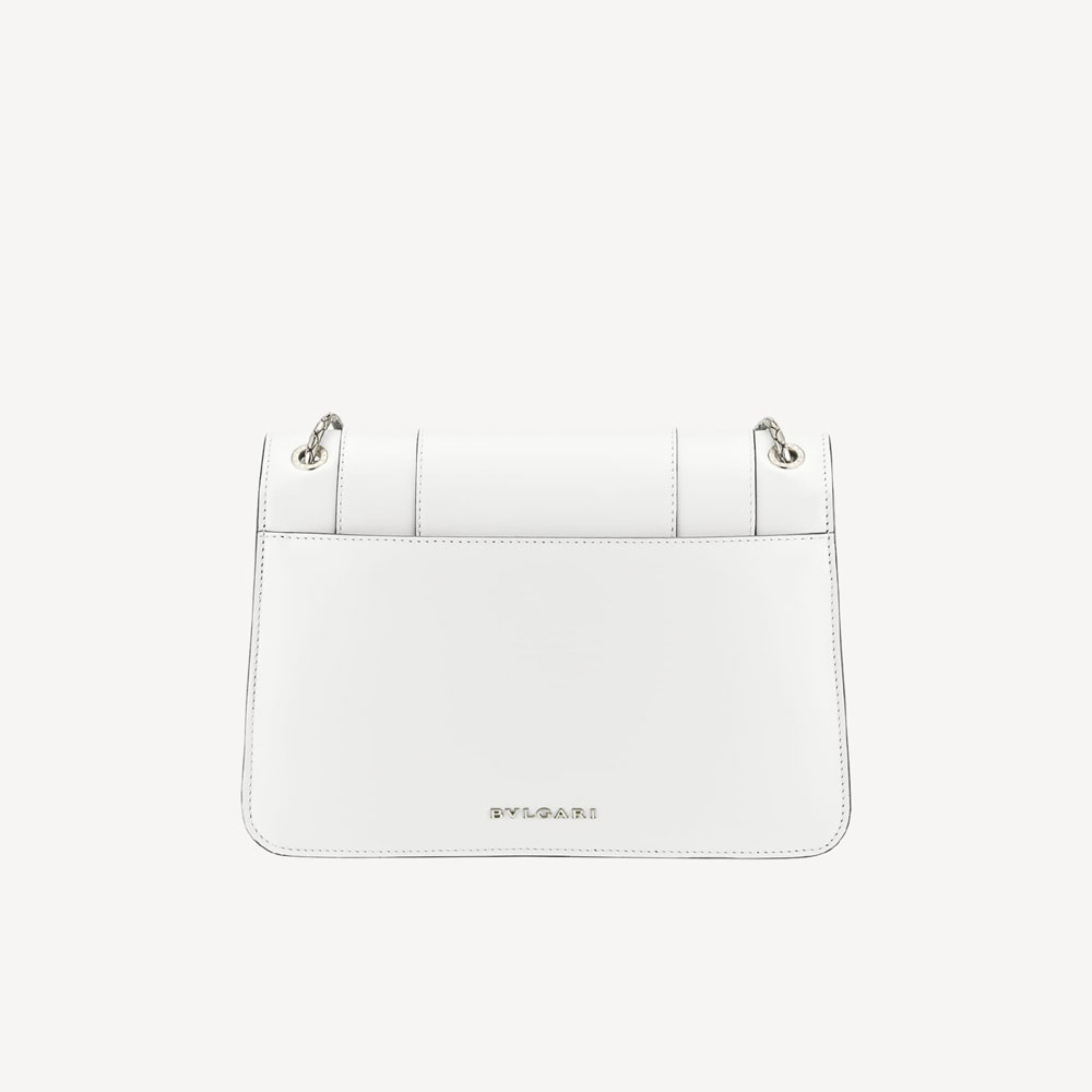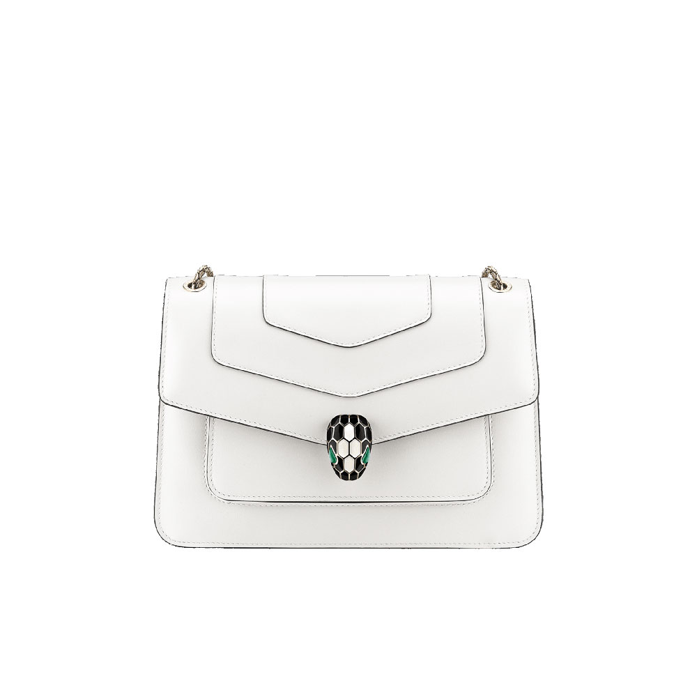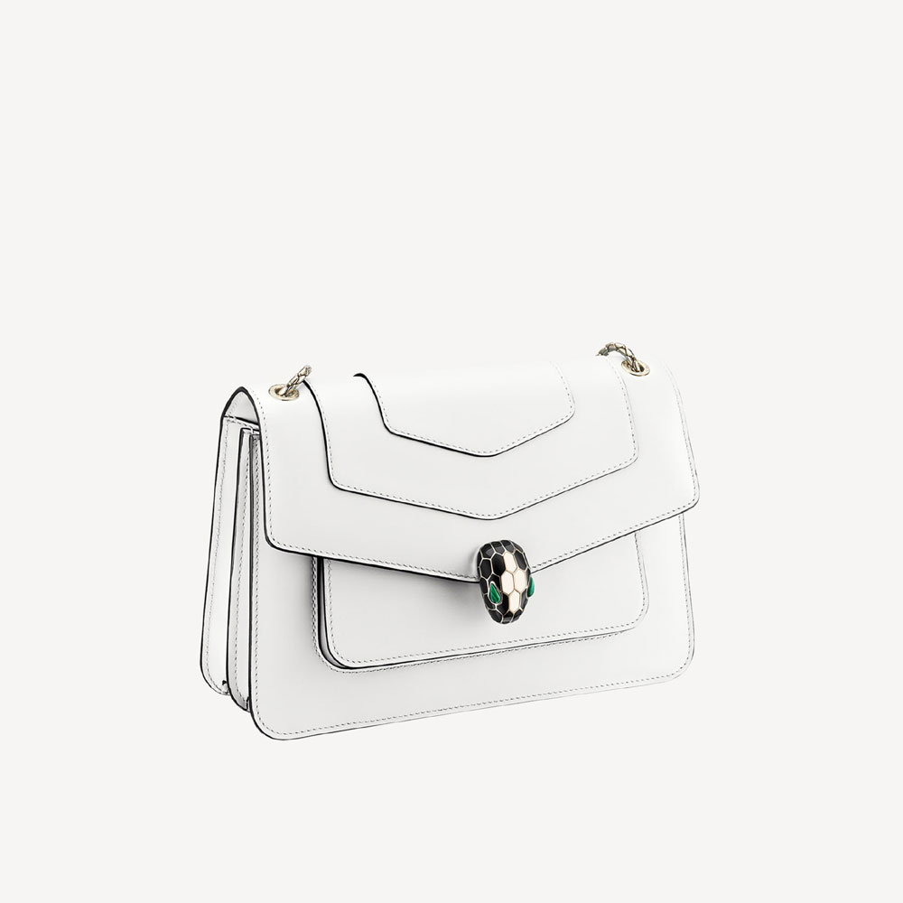 Serpenti Forever medium shoulder bag in white agate calf leather with heather amethyst fuchsia grosgrain lining. Captivating snakehead closure in light gold-plated brass embellished with black and white agate enamel scales and green malachite eyes. Size:25 x 17 x 8 cm
