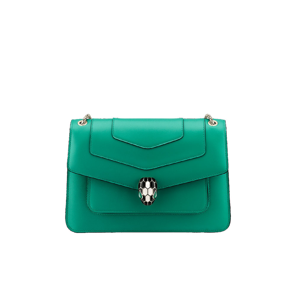 Serpenti Forever medium shoulder bag in emerald green calf leather with amethyst purple grosgrain lining. Captivating snakehead closure in light gold-plated brass embellished with black and white agate enamel scales and green malachite eyes. Size:25 x 17 x 8 cm