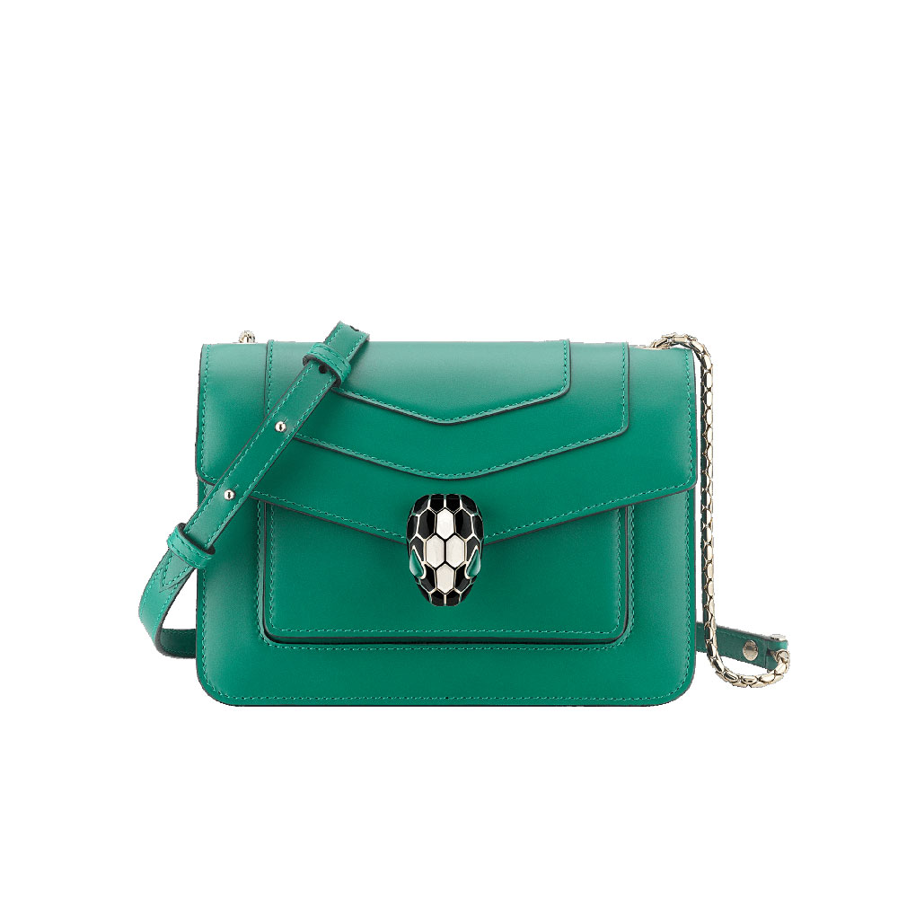 Serpenti Forever small crossbody bag in emerald green calf leather with amethyst purple grosgrain lining. Captivating snakehead closure in light gold-plated brass embellished with black and white agate enamel scales and green malachite eyes. Size:19 x 13 x 7 cm