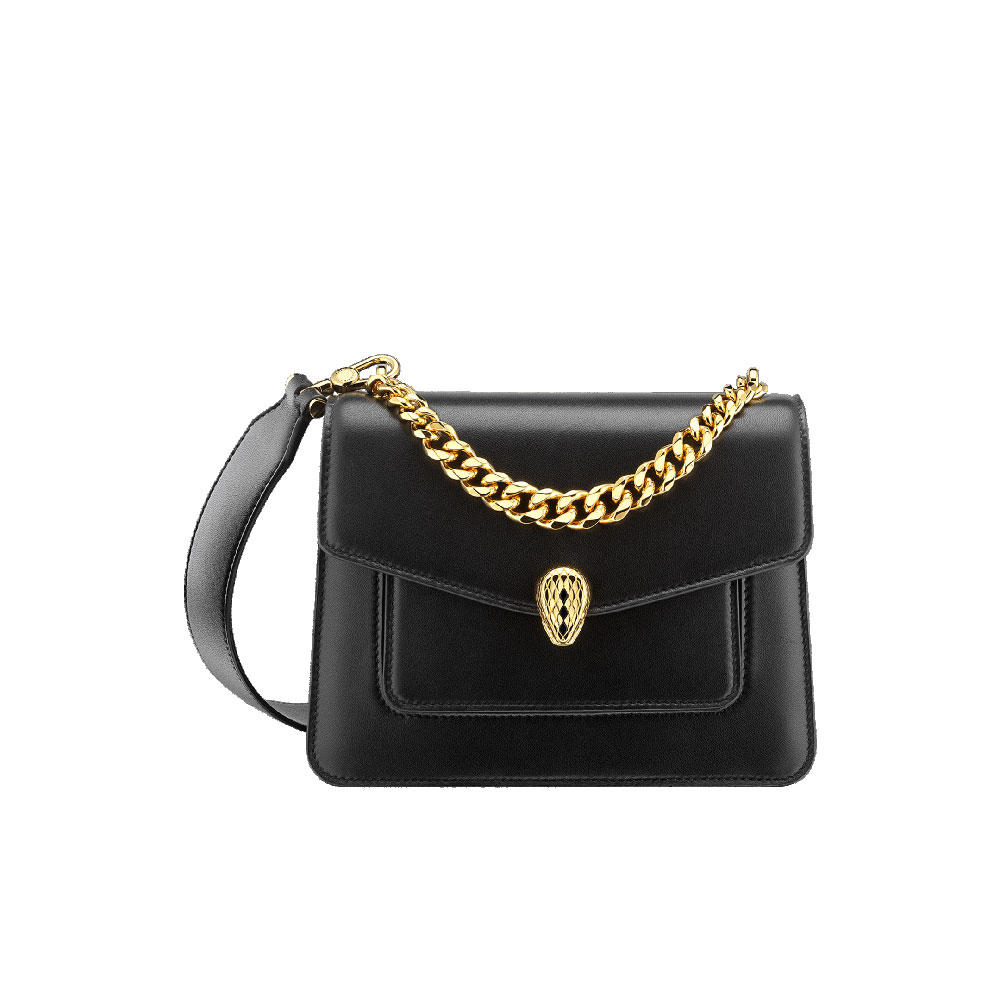 "Serpenti Forever" small maxi chain crossbody bag in black nappa leather, with black nappa leather inner lining. New Serpenti head closure in gold-plated brass, finished with small black onyx scales in the middle, and red enamel eyes. Size:19.5 x 15 x 8.5 cm