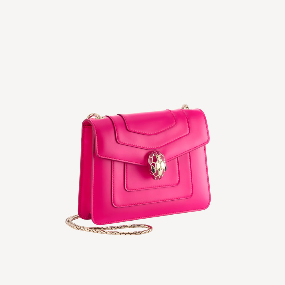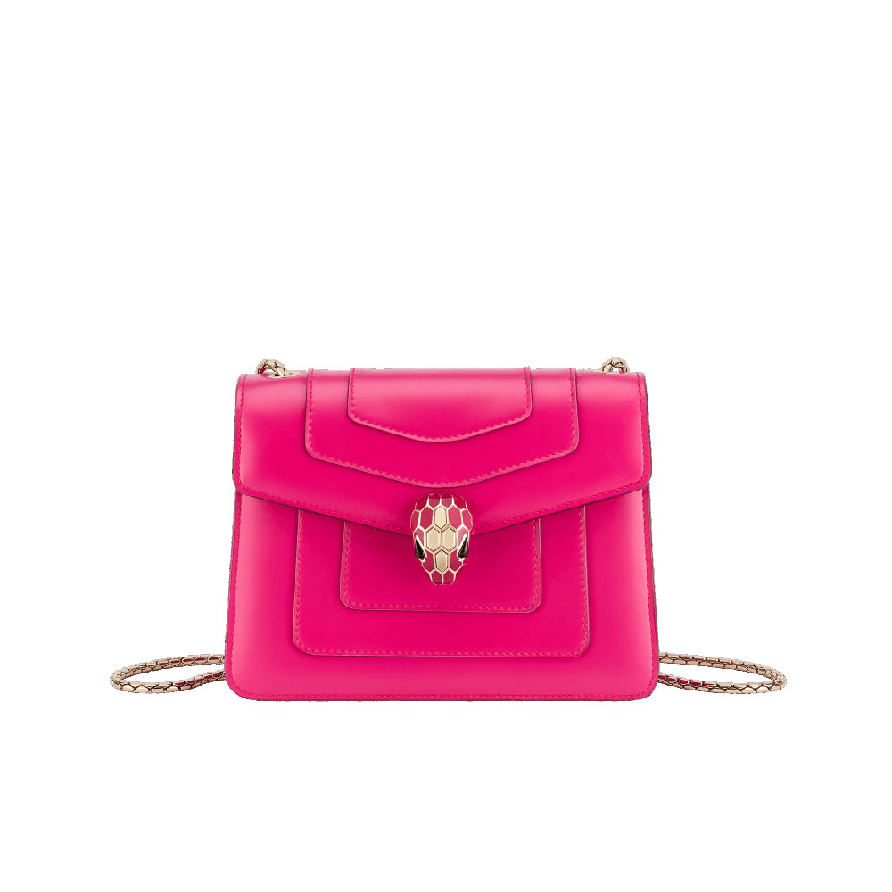 Serpenti Forever small crossbody bag in truly tourmaline fuchsia calf leather with emerald green grosgrain lining. Captivating snakehead magnetic closure in light gold-plated brass embellished with jazzy tourmaline fuchsia enamel and light gold-plated brass scales, and black onyx eyes. Size:20 x 15 x 4.5 cm