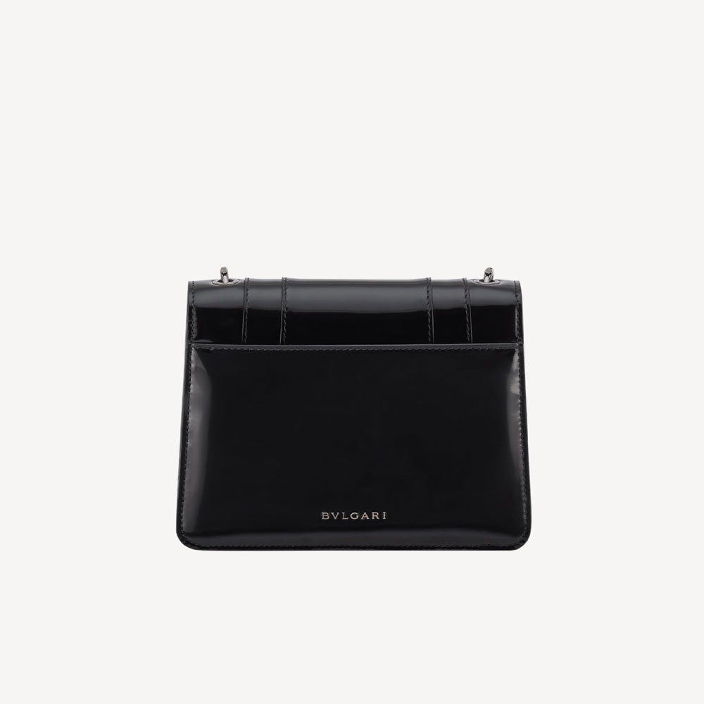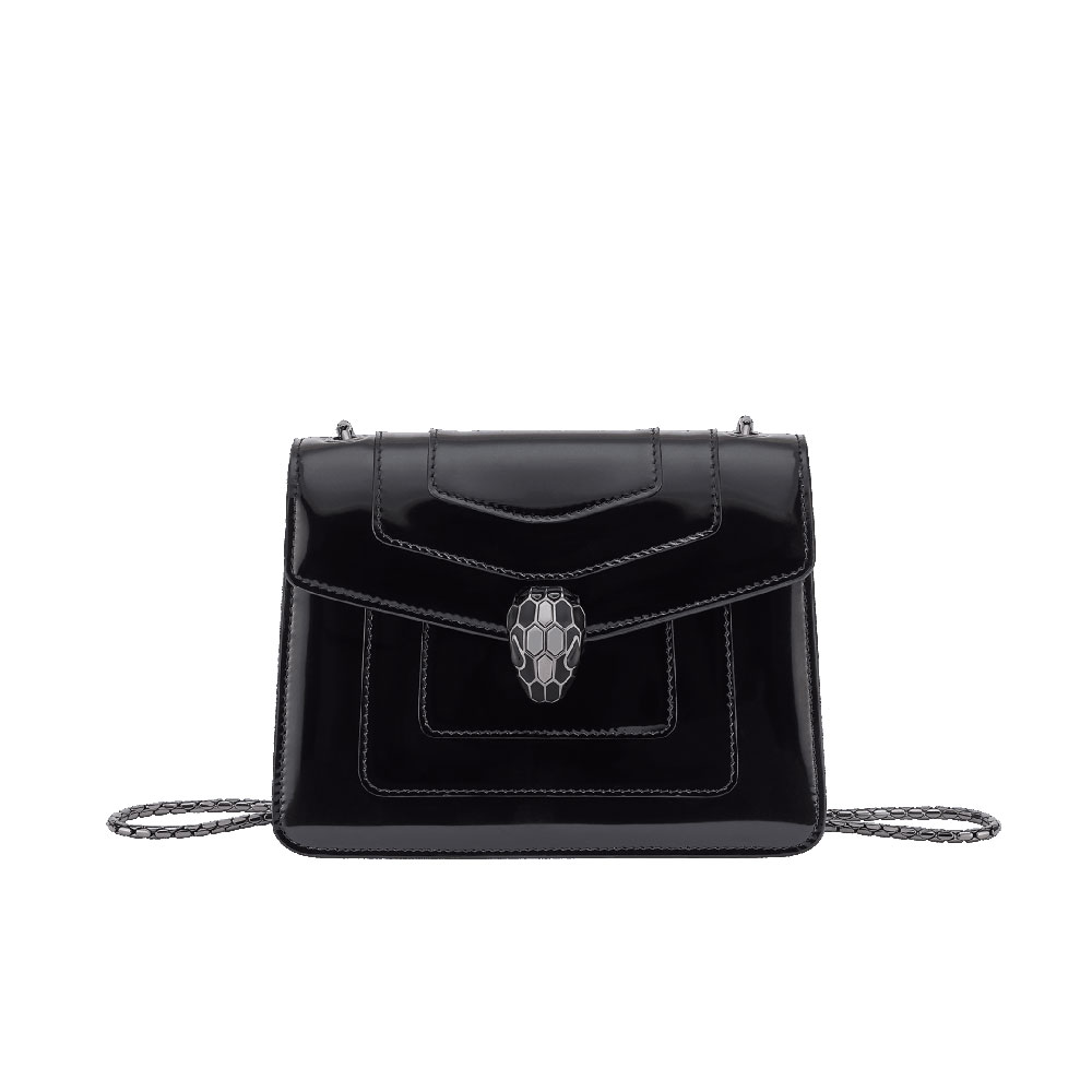 Serpenti Forever small crossbody bag in black Shiny Brushed calf leather with black nappa leather lining. Captivating snakehead magnetic closure in dark ruthenium-plated brass embellished with black enamel and dark ruthenium-plated brass scales, and black onyx eyes. Size:20 x 15 x 4.5 cm