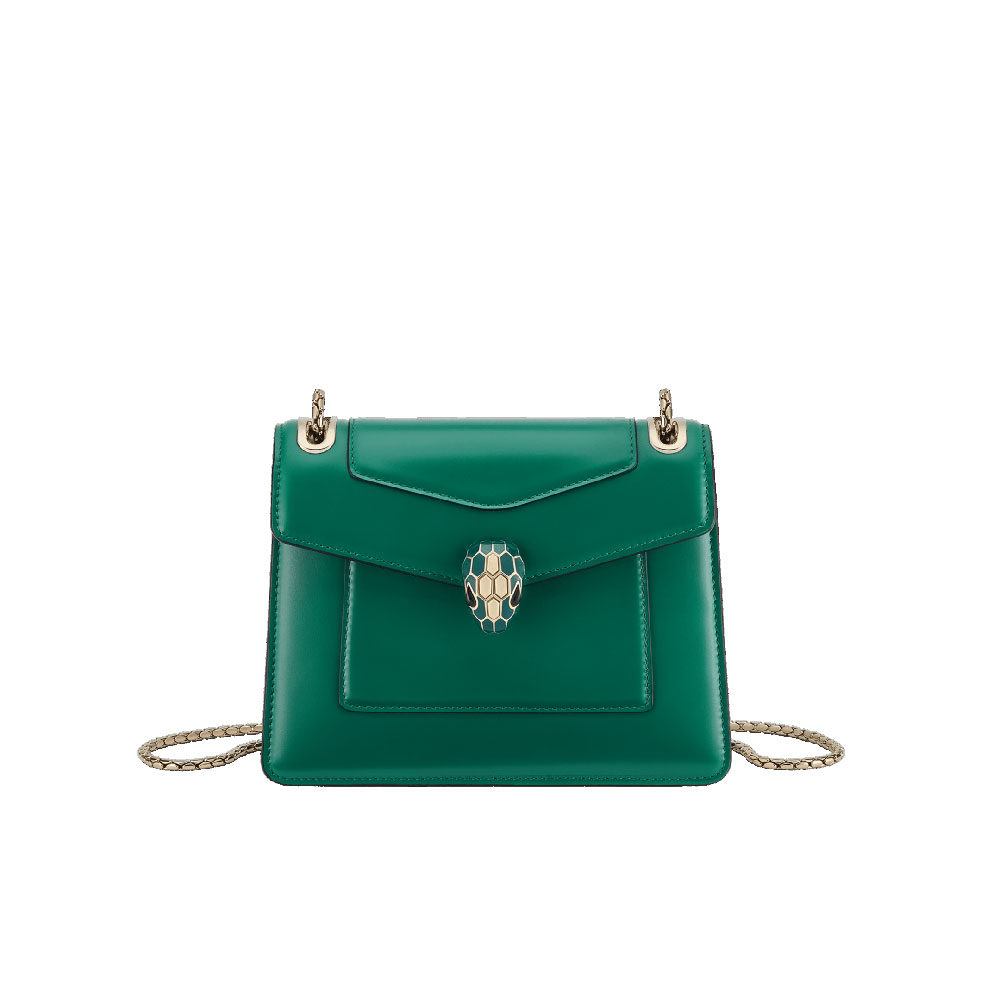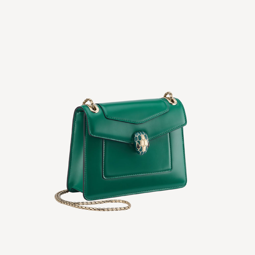 Serpenti Forever Day-to-Night small shoulder bag in emerald green calf leather with black nappa leather lining. Captivating snakehead magnetic closure in light gold-plated brass embellished with deep jade intense green enamel and light gold-plated brass scales, and black onyx eyes. Size:19 x 14 x 6 cm