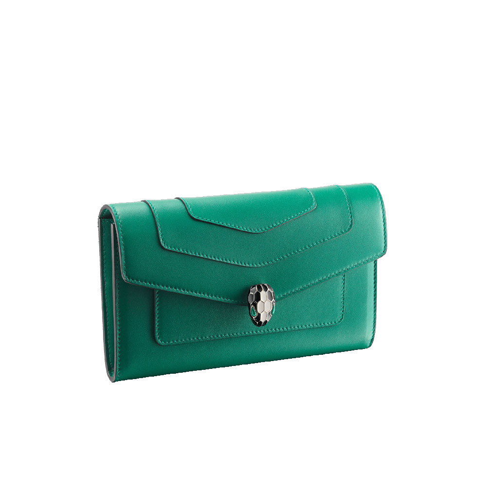 Serpenti Forever large wallet in emerald green calf leather with black nappa leather interior. Captivating snakehead press button closure in light gold-plated brass embellished with black and white agate enamel scales and green malachite eyes. Size:18.5 x 12 x 3 cm