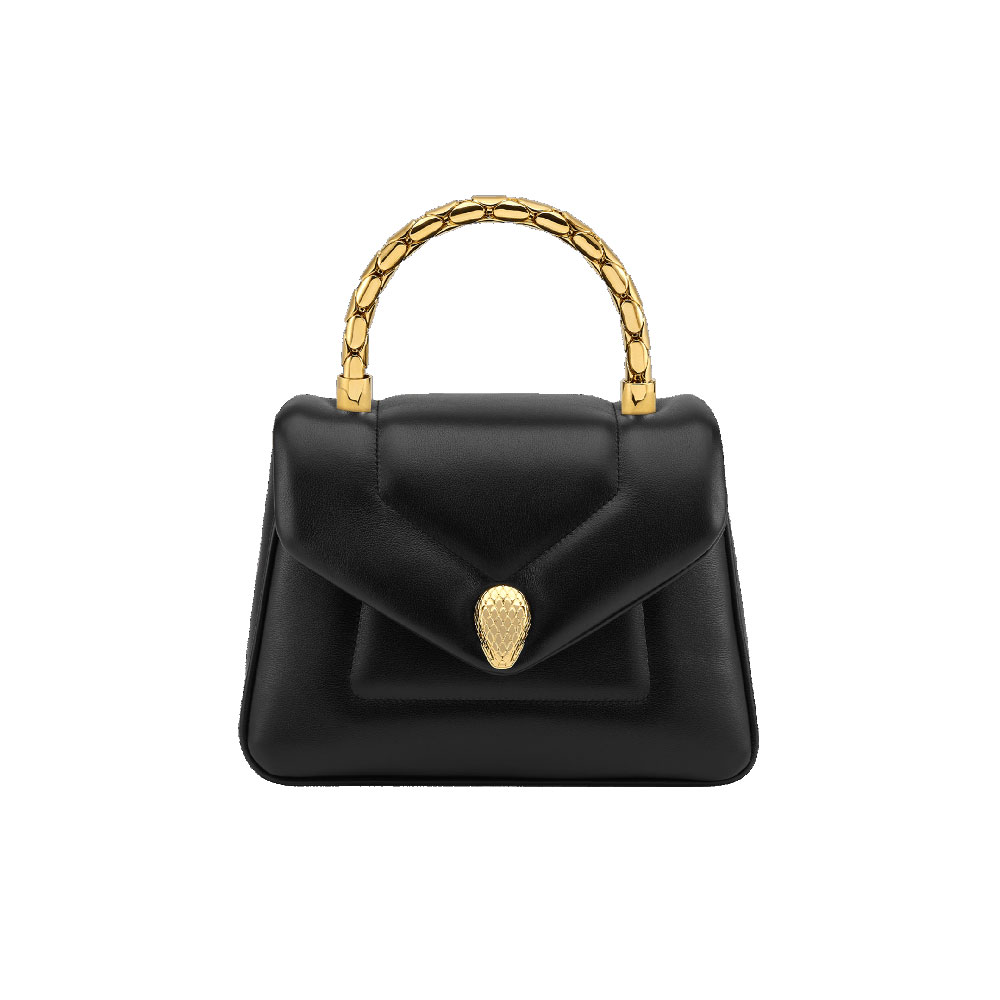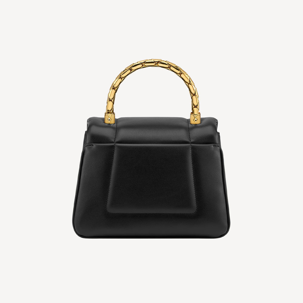 Serpenti Reverse small top handle bag in black quilted Metropolitan calf leather with black nappa leather lining. Captivating snakehead magnetic closure in gold-plated brass embellished with red enamel eyes.