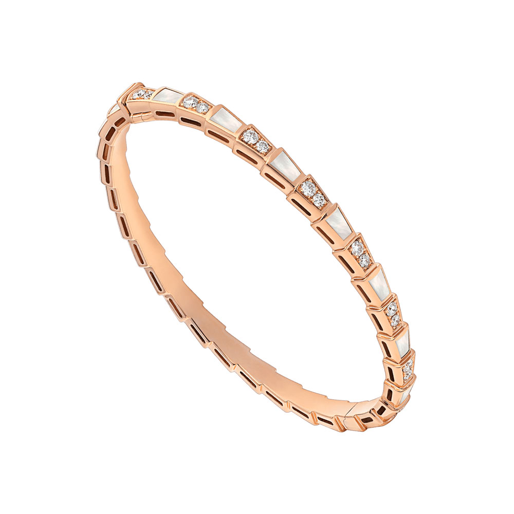 Serpenti Viper 18 kt rose gold bracelet set with mother-of-pearl elements and pave diamonds