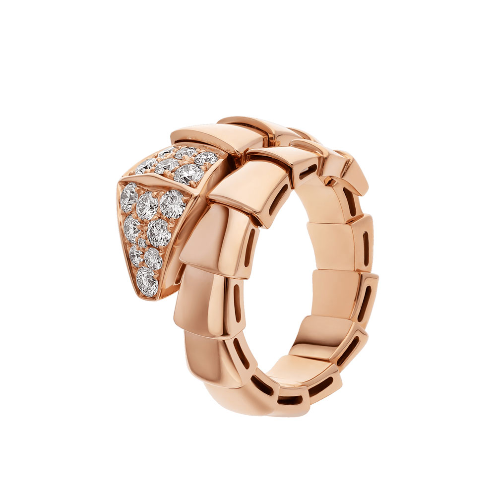 Serpenti Viper one-coil ring in 18 kt rose gold. set with pave diamonds on the head.