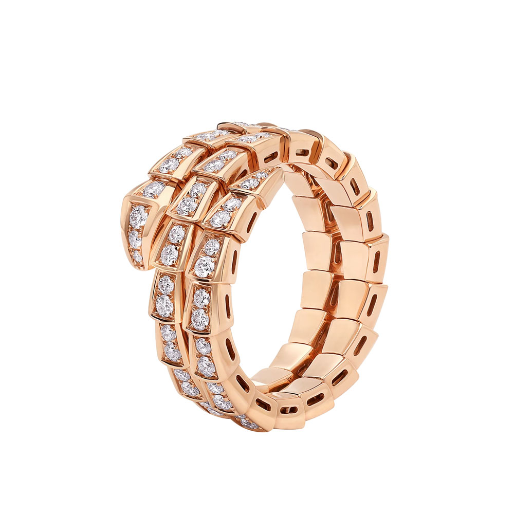 Serpenti Viper two-coil 18 kt rose gold ring. set with pave diamonds