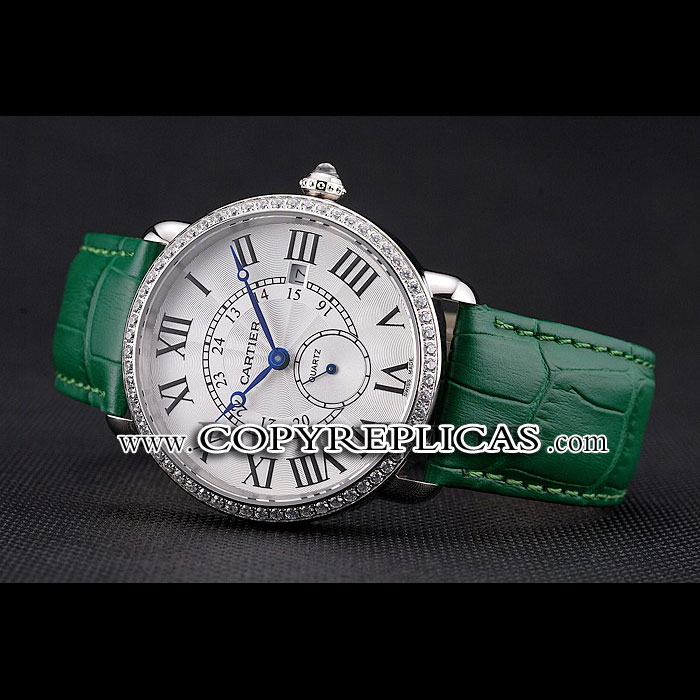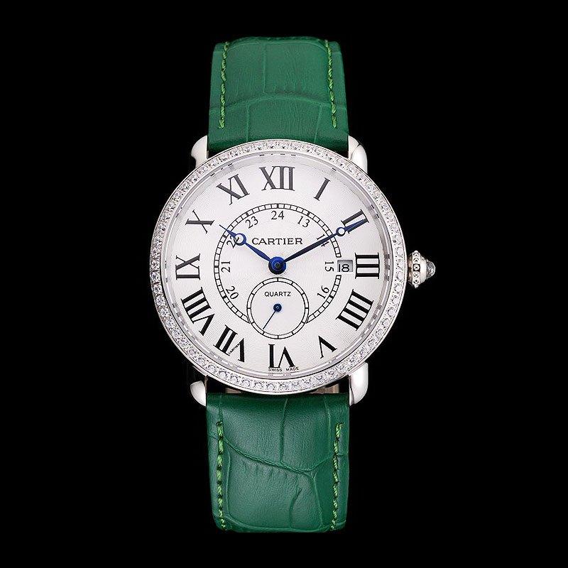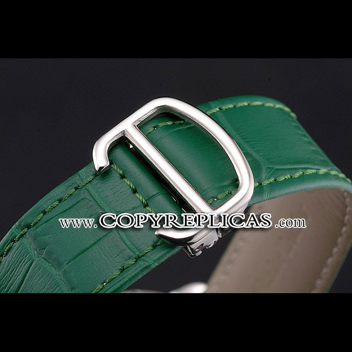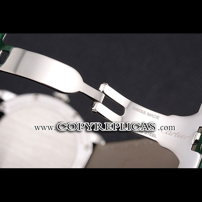 Movement : Quartz (Battery) Quality : Japanese Miyota Case : Polished stainless steel case Back : Polished stainless steel screwed in back with Cartier inscription Bezel : Diamond encrusted polished stainless steel bezel Crown : Diamond stud polished stainless steel crown Bracelet : Cartier heat embossed green crocodile leather strap with polished stainless steel fold-in buckle clasp Band Type : Leather Watch Clasp : Flip Clasp Chronograph : Yes Glass : Sapphire Crystal Color : Green Dial Color : White Gender : Men Diameter : 43 x 40 mm Bracelet Length : 200 x 22 mm Case Thickness : 10 mm Shipping Size : Small