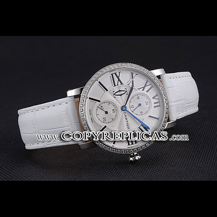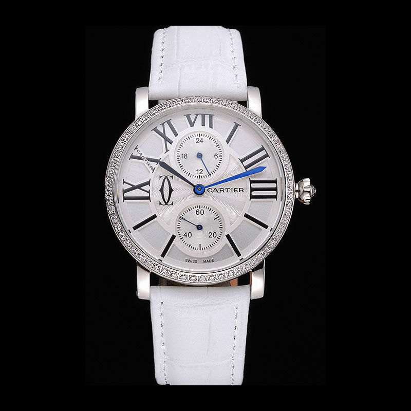 Movement : Quartz (Battery) Quality : Japanese Miyota Case : 18k rose-gold plated case Back : Polished stainless steel screwed down back with Cartier Rotonde inscription Bezel : Diamond encrusted 18k rose-gold plated bezel Crown : Blue crystal stud 18k rose-gold plated cutwork crown Bracelet : Cartier heat embossed white crocodile leather strap with 18k rose-gold plated fold-in buckle clasp Band Type : Leather Watch Clasp : Flip Clasp Chronograph : Yes Glass : Sapphire Crystal Color : White Dial Color : White Gender : Men Diameter : 44 x 38 mm Bracelet Length : 205 x 20 mm Case Thickness : 11 mm Shipping Size : Small