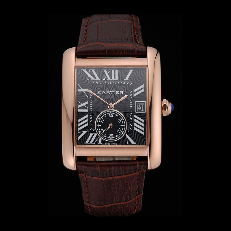 Movement : Quartz (Battery) Quality : Japanese Miyota Case : 18k rose-gold plated case Back : Brushed stainless steel screwed down back with Cartier inscription Bezel : 18k rose-gold plated bezel Crown : Blue sapphire stud polished stainless steel crown Bracelet : Cartier heat embossed brown crocodile leather strap with 18k rose-gold plated fold-in snap clasp Band Type : Leather Watch Clasp : Flip Clasp Glass : Sapphire Crystal Dial Color : Black Gender : Men Diameter : 44 x 36 mm Bracelet Length : 190 x 25 mm Case Thickness : 11 mm Shipping Size : Small