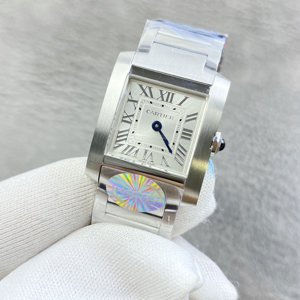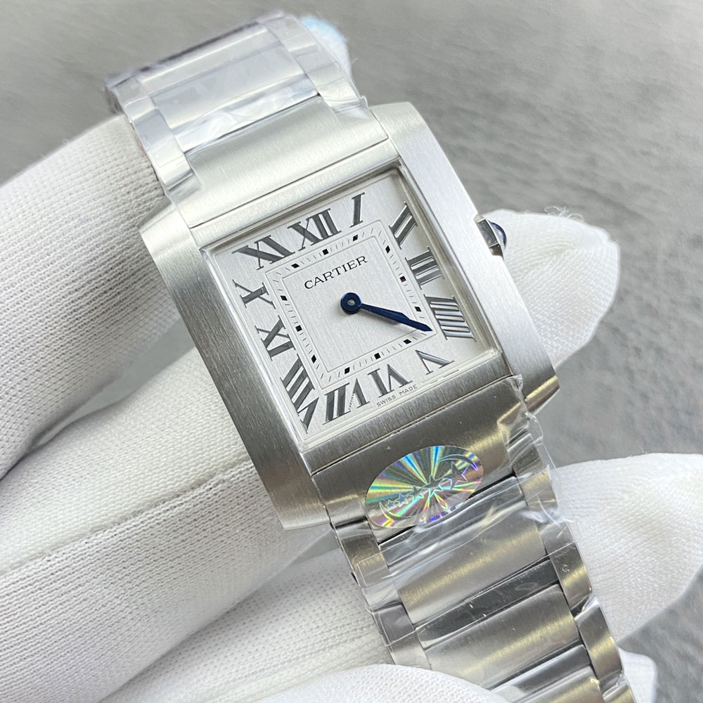 For a sophisticated daytime look, pair this Cartier Tank watch with a crisp white blouse, tailored trousers, and loafers.