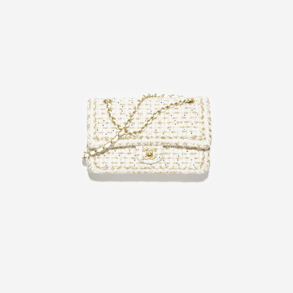 Tweed material with Ecru Gold accentsSignature gold-tone metal hardware