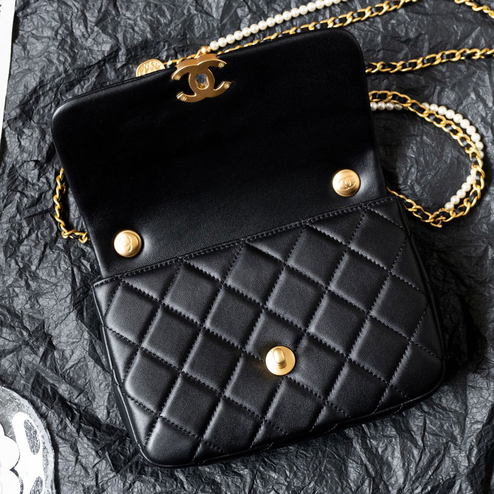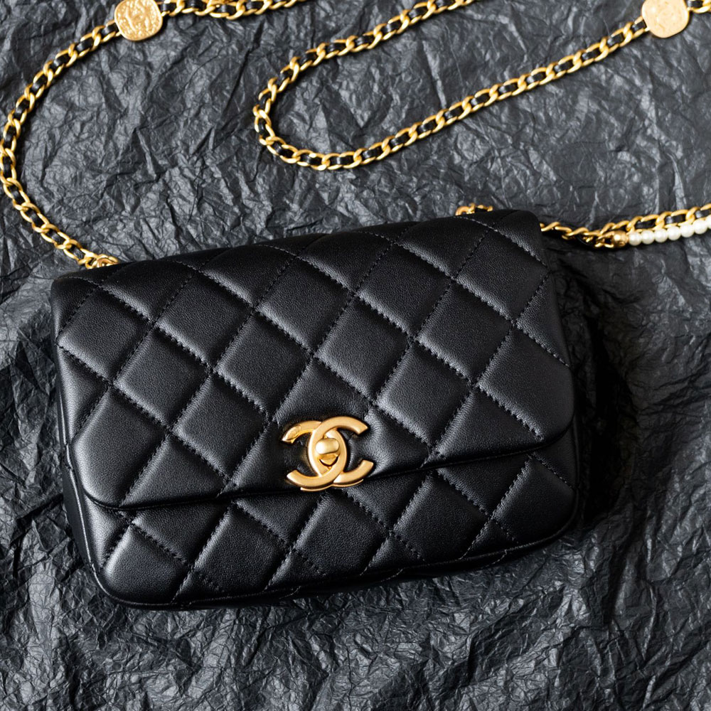 The Chanel Mini Flap Bag in shiny black lambskin effortlessly elevates any ensemble. Pair it with a little black dress for timeless sophistication, or style it with cropped trousers and a silk blouse for polished daytime elegance.