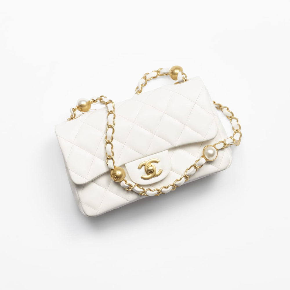 Mini Flap Bag White Shiny Lambskin, Imitation Pearls & Gold-Tone Metal