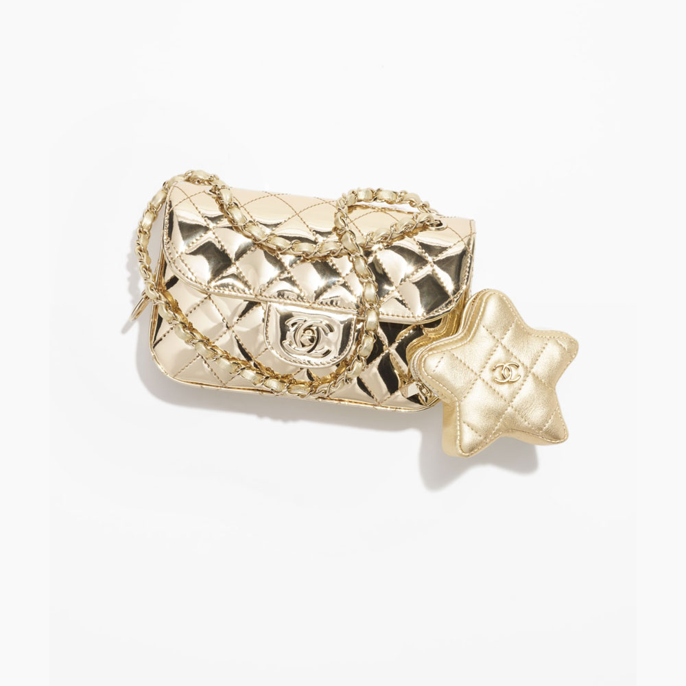 Mini flap bag & star coin purse, Mirror calfskin, metallic calfskin & gold-tone metal, light gold
