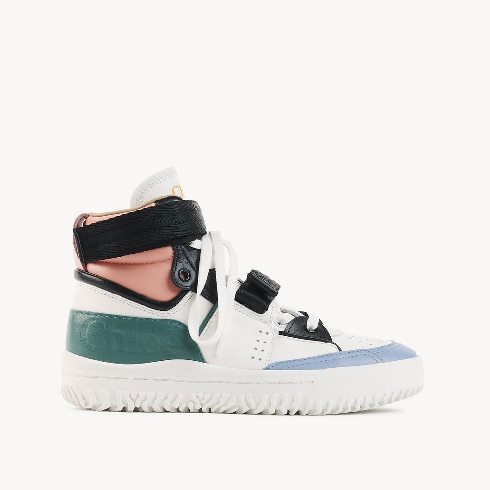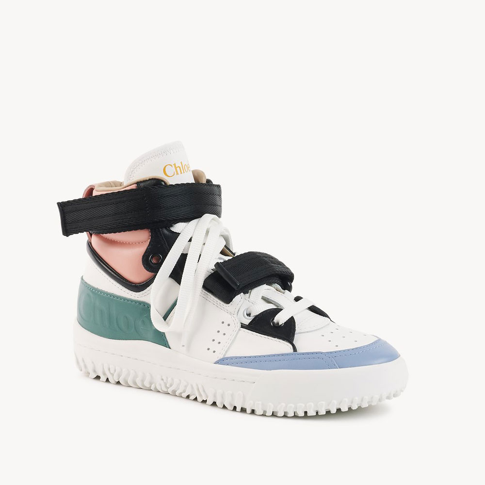 Made from smooth calfskin with a textured rubber sole, the Franckie high-top sneaker revisits the Maison's classic sneaker line in a sporty silhouette embellished with rich details and an effortless attitude.The soft padded back ensures day-long comfort, while Velcro straps tap into the active aesthetic. Wavy lines and a tonal Chloe logo at the side add the Maison's signature details to this sporty yet feminine lace-up sneaker.