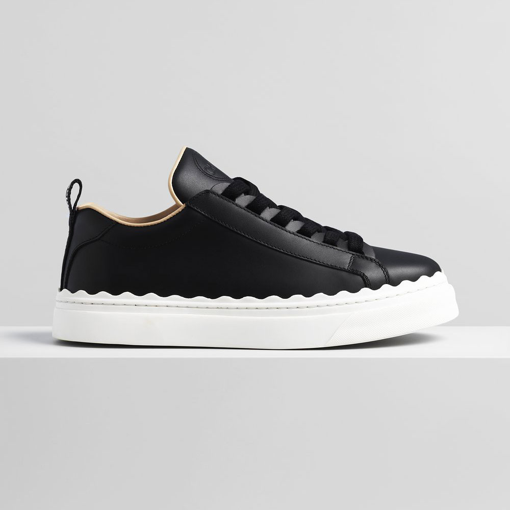 The Lauren family includes an active daywear option with its lace-up sneaker cut from smooth calfskin.The low-top sneaker has a sporty aesthetic. enhanced by the flexible rubber sole and the contrasting nylon back loop with the Chloe logo. The signature Lauren scallops echo the line��s romantic DNA. while the round toe shape lends a feminine finish to this ladies' sneaker.