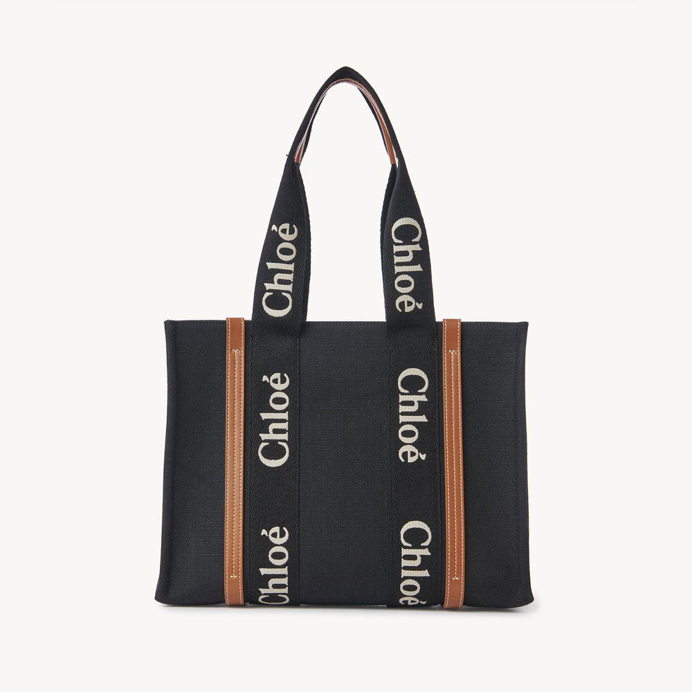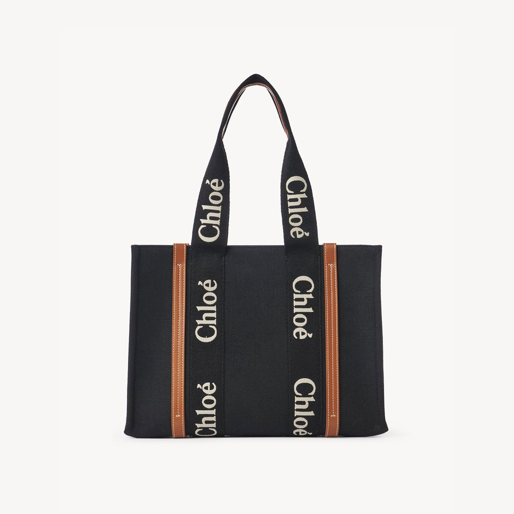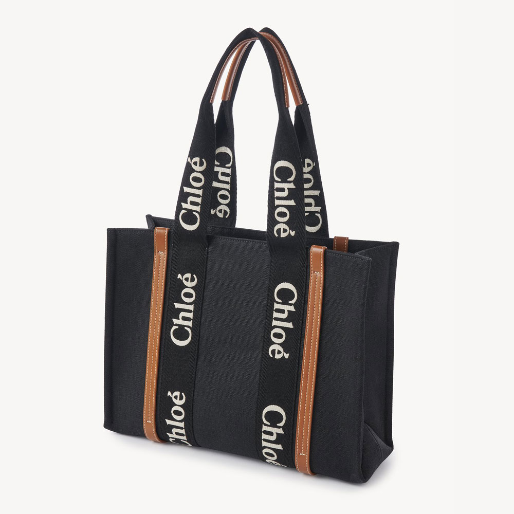 Crafted from linen canvas detailed with shiny calfskin strips, this medium Woody tote bag is a spacious bag with a strong summer attitude. The roomy inside compartment includes a practical flat pocket.The bag's sharp, modern lines are emphasized by the contrasting vertical leather strips and the signature Chloe logo embroidery. Carry this tote bag comfortably on the shoulder.All about Woody...The Woody line is characterized by the signature Chloe logo carried over from the Maison's iconic mules. It showcases a modern, minimalist silhouette ranging from nano to large sizes.
